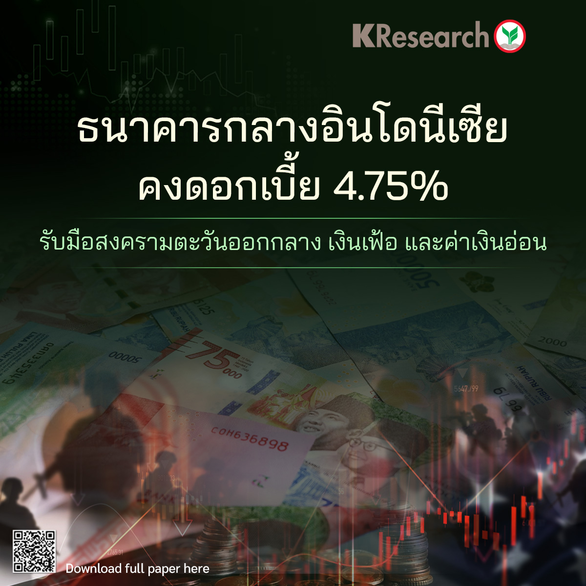 · ศูนย์วิจัยกสิกรไทย มองว่า โอกาสในการปรับลดดอกเบี้ยของ BI มีจำกัดมากขึ้น จากความจำเป็นในการรักษาเสถียรภาพค่าเงินควบคู่กับการควบคุมเงินเฟ้อจากต้นทุนพลังงานที่เพิ่มขึ้น อย่างไรก็ตาม หากสถานการณ์ความขัดแย้งในตะวันออกกลางคลี่คลายลงในช่วงครึ่งแรกของปีและแรงกดดันต่อค่าเงินและเงินเฟ้อลดลง มีความเป็นไปได้ที่ BI จะกลับมาปรับลดอัตราดอกเบี้ยในช่วงครึ่งหลังของปี 2026 โดยอาจปรับลดได้ราว 1-2 ครั้ง สู่ระดับประมาณ 4.25%