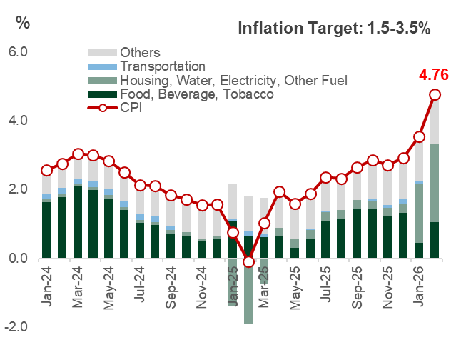 - แรงกดดันเงินเฟ้อจากราคาพลังงาน แม้รัฐบาลยังตรึงราคาน้ำมันผ่านมาตรการอุดหนุน แต่ความเสี่ยงจากราคาน้ำมันโลกที่ปรับสูงขึ้นจากสงครามตะวันออกกลางยังคงเป็นปัจจัยกดดันสำคัญ โดยเงินเฟ้อเดือน ก.พ.อยู่ที่ 4.76% สูงกว่ากรอบเป้าหมายของ BI (1.5%-3.5%) เป็นผลของฐานต่ำในปีก่อนที่มีมาตรการลดค่าไฟฟ้า อย่างไรก็ดี เงินเฟ้อมีแนวโน้มเร่งขึ้นตามราคาพลังงานในระยะถัดไป จึงเป็นข้อจำกัดต่อการลดดอกเบี้ย (รูปที่ 1)