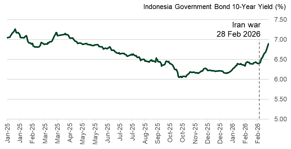 - ความเสี่ยงด้านการคลังเริ่มสะท้อนผ่านตลาดพันธบัตร อัตราผลตอบแทนพันธบัตรรัฐบาลอินโดนีเซียอายุ 10 ปีปรับเพิ่มขึ้นมาอยู่ที่ประมาณ 6.9% ณ 16 มี.ค. ซึ่งเป็นระดับสูงสุดในรอบหลายเดือน การปรับขึ้นดังกล่าวเกิดจากปัจจัยผสมทั้งแรงกดดันจากภาวะการเงินโลกตึงตัว และการลดความเสี่ยงของนักลงทุน (Risk-off) จากความกังวลต่อภาระการอุดหนุนพลังงานและแนวโน้มการขาดดุลงบประมาณ ส่งผลให้ต้นทุนการกู้ยืมของภาครัฐมีแนวโน้มเพิ่มขึ้นในระยะถัดไป