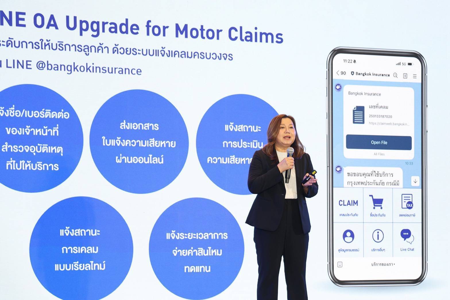 • LINE OA Upgrade for Motor Claims ยกระดับการให้บริการลูกค้าด้วยระบบแจ้งเคลมรถยนต์แบบครบวงจรผ่าน LINE @bangkokinsurance เพื่อเพิ่มความสะดวก รวดเร็ว และเสริมความอุ่นใจให้แก่ลูกค้า โดยสามารถรับทราบข้อมูลสำคัญต่างๆ จากการเคลมประกันภัยรถยนต์ได้อย่างต่อเนื่อง เช่น การแจ้งชื่อและเบอร์โทรศัพท์ของเจ้าหน้าที่สำรวจอุบัติเหตุที่จะเดินทางเข้าไปดูแล การส่งเอกสารใบแจ้งความเสียหายผ่านช่องทางออนไลน์ การแจ้งสถานะการประเมินความเสียหายของรถยนต์ ตลอดจนการติดตามสถานะการเคลมแบบเรียลไทม์ พร้อมทั้งแจ้งระยะเวลาการซ่อมและการจ่ายค่าสินไหมทดแทน นอกจากนี้ บริษัทฯ อยู่ระหว่างการพัฒนา LINE OA for Partners เพื่อช่วยอำนวยความสะดวกและสนับสนุนการทำงานของตัวแทนและนายหน้า ให้มีความคล่องตัวและบริหารจัดการได้ดียิ่งขึ้น ซึ่งจะนำไปสู่การดูแลลูกค้าได้อย่างรวดเร็วและเต็มประสิทธิภาพ