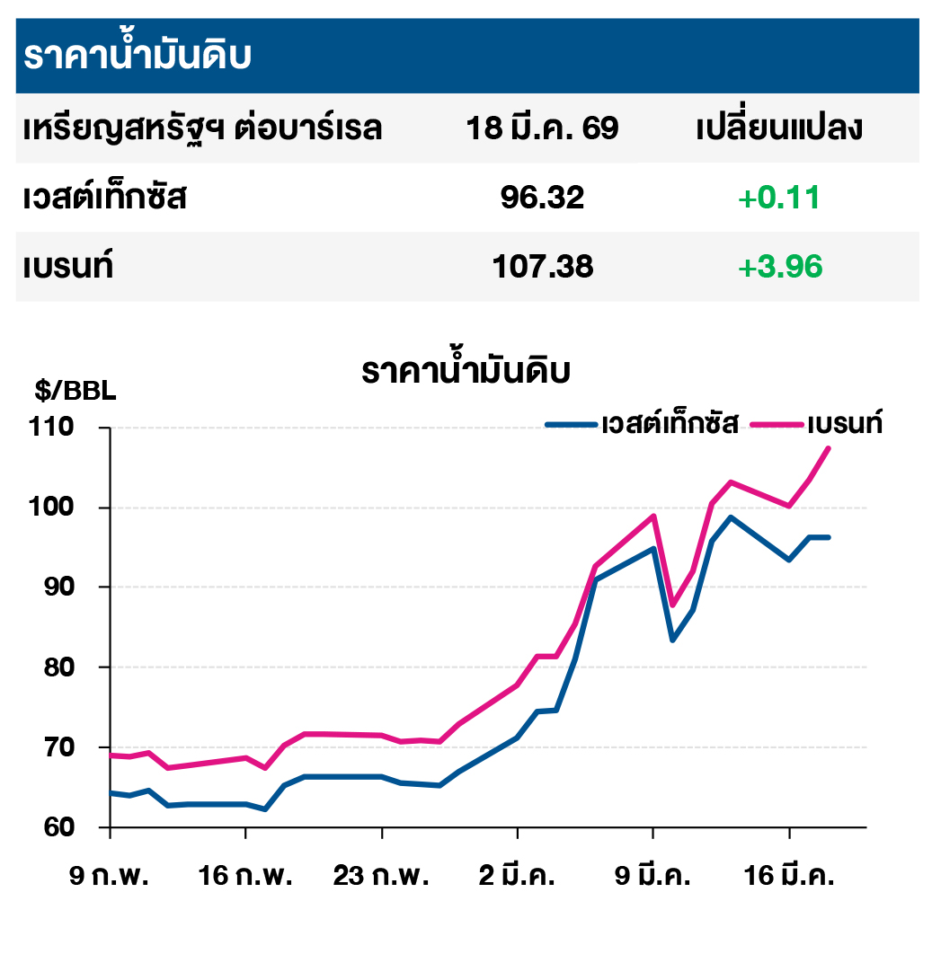 (+) ราคาน้ำมันดิบเวสต์เท็กซัสและเบรนท์ปรับเพิ่มขึ้น หลังอิสราเอลโจมตีแหล่งเก็บก๊าซและน้ำมันในเซาท์พาร์ส (South Pars) และอาซาลูเยห์ (Asaluyeh) ของอิหร่าน ทั้งนี้ แหล่งก๊าซเซาท์พาร์สถือเป็นแหล่งก๊าซธรรมชาติที่ใหญ่ที่สุดของโลก ส่งผลให้อิหร่านเตรียมตอบโต้ในวงกว้าง โดยกองกำลังพิทักษ์การปฏิวัติอิสลามของอิหร่าน (IRGC) ออกคำเตือนให้ประชาชนอพยพออกจากโรงกลั่นน้ำมันซามเรฟ (Samref) และนิคม ปิโตรเคมีจูเบล (Jubail) ในซาอุดีอาระเบีย แหล่งก๊าซอัล-ฮัสซัน (Al-Hassan) ในสหรัฐอาหรับเอมิเรตส์ รวมถึงโรงกลั่นและโรงปิโตรเคมีในกาตาร์ เนื่องจากสถานที่เหล่านี้จะถูกตกเป็นเป้าหมายการโจมตีของอิหร่าน นอกจากนี้เจ้าหน้าที่ระดับสูงของอิหร่านเปิดเผยว่าผู้นำสูงสุดคนใหม่ยังคงปฏิเสธข้อเสนอเพื่อลดความตึงเครียดจากประเทศตัวกลาง