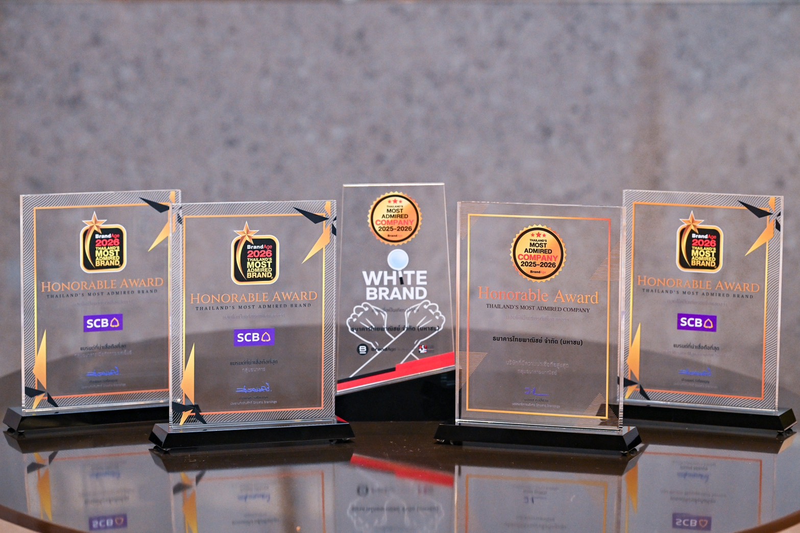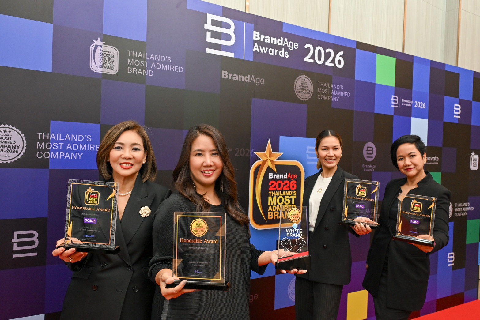 ธนาคารไทยพาณิชย์ กวาด 5 รางวัลสุดยอดองค์กรและแบรนด์น่าเชื่อถือ (2025-2026 Thailand's Most Admired Company) และ 2026 Thailand's Most Admired Brand สูงสุดในกลุ่มธนาคาร จากเวที BrandAge Awards 2026 ตอกย้ำความน่าเชื่อถือที่ได้รับความไว้วางใจจากผู้บริโภคทุกมิติ ทั้งระดับองค์กร และระดับแบรนด์ SCB ครองแชมป์ครอบคลุมกลุ่มแบรนด์ ธนาคารพาณิชย์ ต่อเนื่องสามปีซ้อน ธนาคารเพื่อเอสเอ็มอีต่อเนื่อง 7 ปีซ้อน ธนาคารและบริการทางการเงินกลุ่ม Wealth Management Service สองปีซ้อน และครั้งแรกกับการได้รับการยกย่องเป็น สุดยอดแบรนด์ธรรมาภิบาล ขับเคลื่อนการดำเนินงานด้วยหลักธรรมาภิบาลที่ผู้บริโภคยอมรับ ตอกย้ำความสำเร็จในแนวทาง “อยู่ อย่าง ยั่งยืน (Live Sustainably) ที่มุ่งมั่นนำพลังการเงินร่วมขับเคลื่อนธุรกิจไทยเปลี่ยนผ่านสู่แนวทางการดำเนินงานที่สอดคล้องกับหลัก ESG และเป้าหมายการพัฒนาที่ยั่งยืนของประเทศ ตามกลยุทธ์ Digital Bank with Human Touch นำศักยภาพทางดิจิทัลยกระดับบริการเพื่อมอบประสบการณ์อย่างไร้รอยต่อในทุกช่องทางโดยมีลูกค้าเป็นศูนย์กลางอย่างแท้จริง โดยมี นางสาวอินทิรา จิตรานุเคราะห์ ผู้ช่วยผู้จัดการใหญ่ Head of Marketing นางสาวอรุณี บุญเกิด ผู้ช่วยผู้จัดการใหญ่ ผู้บริหารสายงาน Business Banking I นางสาวรุ่งเพ็ชร พรรณาปยุกต์ ผู้อำนวยการอาวุโส Segment Marketing and Privilege Management และ นางจันทร์เพ็ญ จันทนา ผู้อำนวยการอาวุโส ผู้บริหารฝ่าย Social Media, Digital Content & Creative Management เป็นผู้แทนธนาคารเข้ารับมอบรางวัล เมื่อเร็วๆ นี้