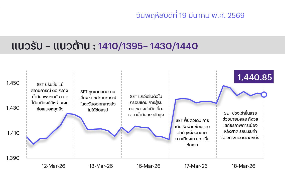 คาด SET ปรับลง กดดันจาก 1) ราคาน้ำมันเบรนท์พุ่งทะลุ $110/bbl อิหร่านขู่โต้กลับแหล่งพลังงาน 3 ชาติอาหรับหลังอิสราเอลโจมตีคลังก๊าซและน้ำมันขนาดใหญ่ของอิหร่าน 2) Fed อาจลดดอกเบี้ยเพียง 1 ครั้งในช่วงที่เหลือของปีนี้ 3) วันนี้โหวตลงมติเลือกนายกฯ แม้จะยังคงดำเนินตามขั้นตอนต่อไปได้ แต่ประเด็นที่ศาลรัฐธรรมนูญมีมติรับคำร้องกรณีบัตรเลือกตั้งไว้วินิจฉัย ถือเป็น overhang ที่อาจส่งผลต่อการลงทุน ประเมินแนวรับ 1410/1395 แนวต้าน 1430/1440