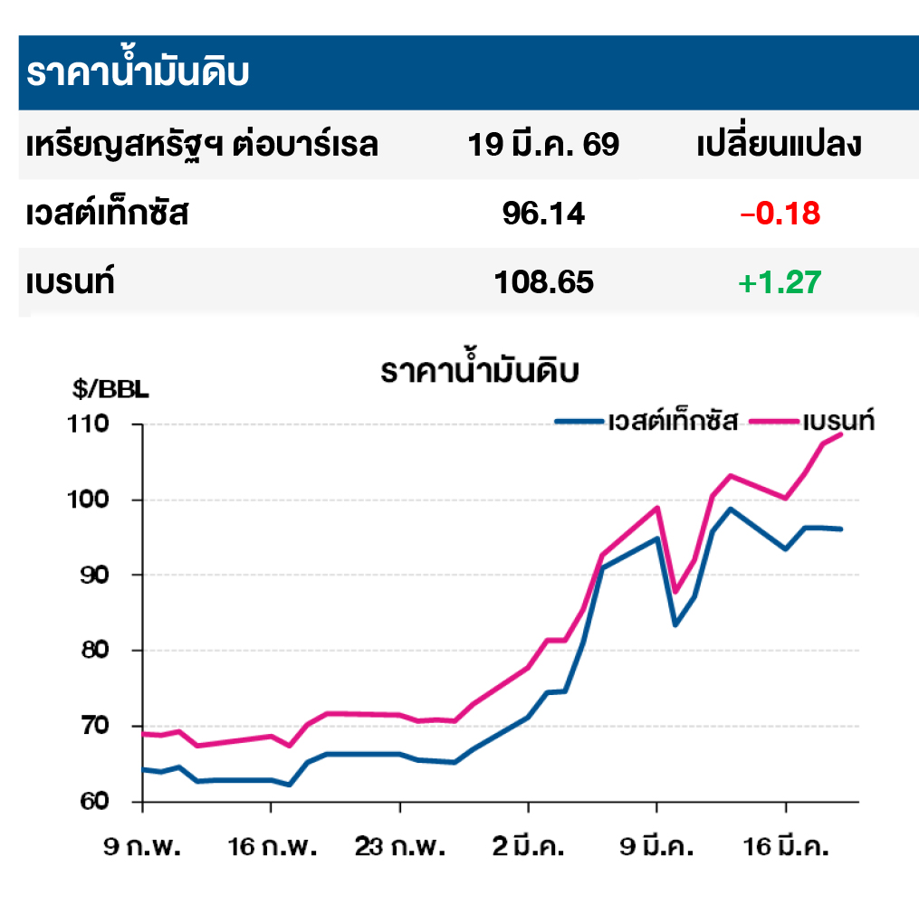 (+) ราคาน้ำมันดิบเบรนท์ปรับเพิ่มขึ้น จากสถานการณ์ความขัดแย้งในตะวันออกกลางมีสัญญาณทวีความรุนแรงขึ้น หลังอิหร่านได้ทำการโจมตี โรงกลั่นและโรงปิโตรเคมีในภูมิภาคตะวันออกกลาง โดยล่าสุด อิหร่านได้ทำการโจมตีโรงผลิตก๊าซธรรมชาติเหลว (LNG) ในพื้นที่ราส ลัฟฟาน (Ras Laffan) ประเทศกาตาร์ ซึ่งเป็นโรงผลิต LNG ที่ใหญ่ที่สุดในโลกสร้างความเสียหายอย่างรุนแรงทำให้กระบวนการผลิตต้องถูกระงับ