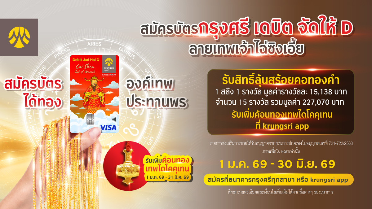กรุงศรี (ธนาคารกรุงศรีอยุธยา จำกัด (มหาชน)) มอบสิทธิพิเศษสำหรับลูกค้าที่สมัครบัตรกรุงศรี เดบิต จัดให้ D ลายเทพเจ้าไฉ่ซิงเอี้ยที่ธนาคารกรุงศรีอยุธยา ทุกสาขา หรือผ่าน krungsri app รับสิทธิ์เพื่อลุ้นรับสร้อยคอทองคำ 1 สลึง จำนวน 15 รางวัล รวมมูลค่า 227,070 บาท ตั้งแต่วันที่ 1 มกราคม - 30 มิถุนายน 2569 และรับเพิ่มค้อนทองเทพไดโคคุเทน เสริมโชคลาภ จากวัดเซนโซจิ ประเทศญี่ปุ่น มูลค่า 500 บาท เมื่อสมัครบัตรกรุงศรี เดบิต จัดให้ D ลายเทพเจ้าไฉ่ซิงเอี้ย ผ่านธนาคารกรุงศรีอยุธยาทุกสาขา หรือ ผ่าน krungsri app ในระหว่างวันที่ 1 มกราคม 2569 – 31 มีนาคม 2569 โดยสามารถกดรับสิทธิ์ได้ที่ krungsri app ที่เมนูสิทธิประโยชน์