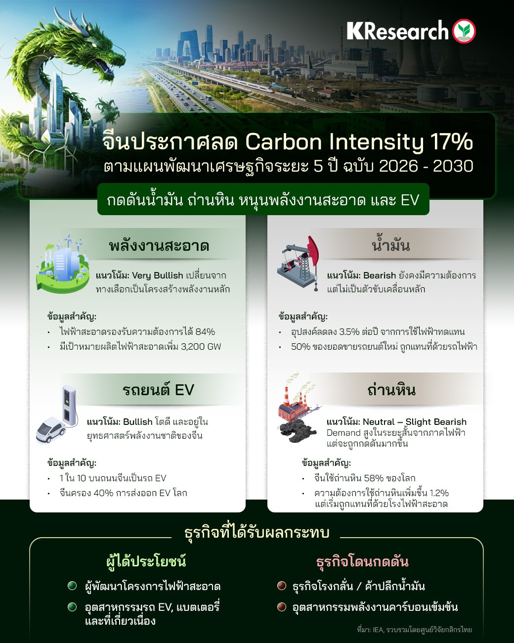 • จีนประกาศเป้าหมายลดความเข้มข้นการปล่อยคาร์บอนต่อ GDP (Carbon Intensity) ลง 17% ระหว่างปี 2026 - 2030 ตามแผนพัฒนาเศรษฐกิจระยะ 5 ปี ฉบับใหม่ โดยกำหนดเป้าการปล่อย CO2 สูงสุด (peak emission) ในปี 2030 และตั้งเป้าเป็นกลางทางคาร์บอน (Carbon Neutrality) ในปี 2060 ส่งผลให้การลงทุนใน 4 กลุ่มพลังงานหลัก ได้แก่ พลังงานสะอาด รถยนต์ EV น้ำมัน และถ่านหิน มีแนวโน้ม Slight Bearish ถึง Very Bullish ในช่วง 5 ปีตามแผนดังกล่าว