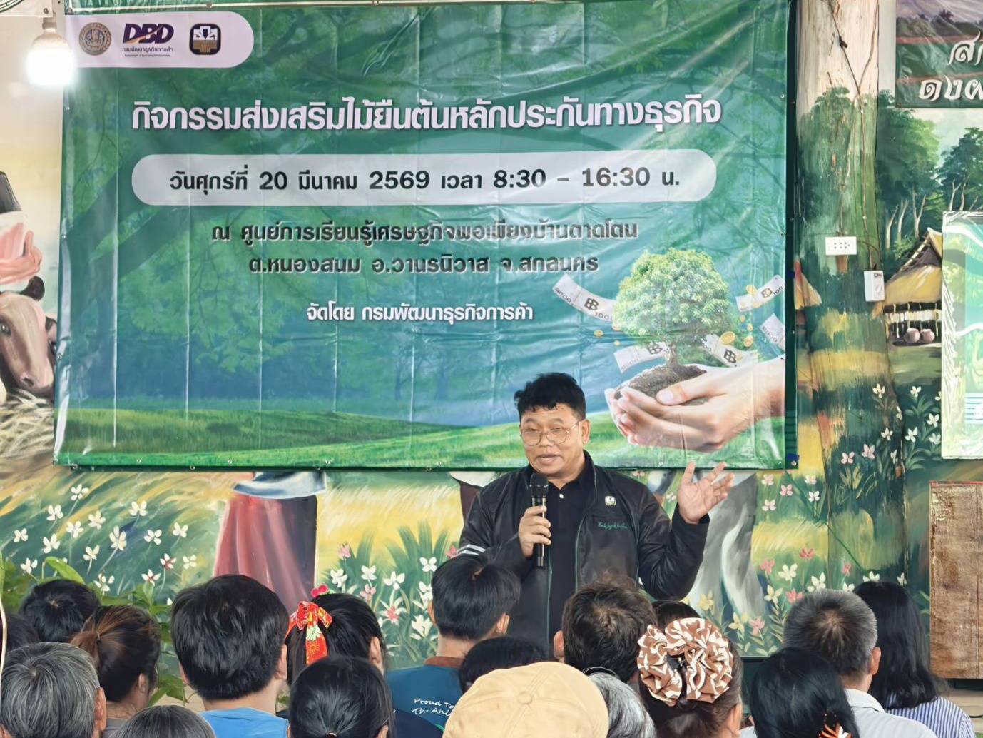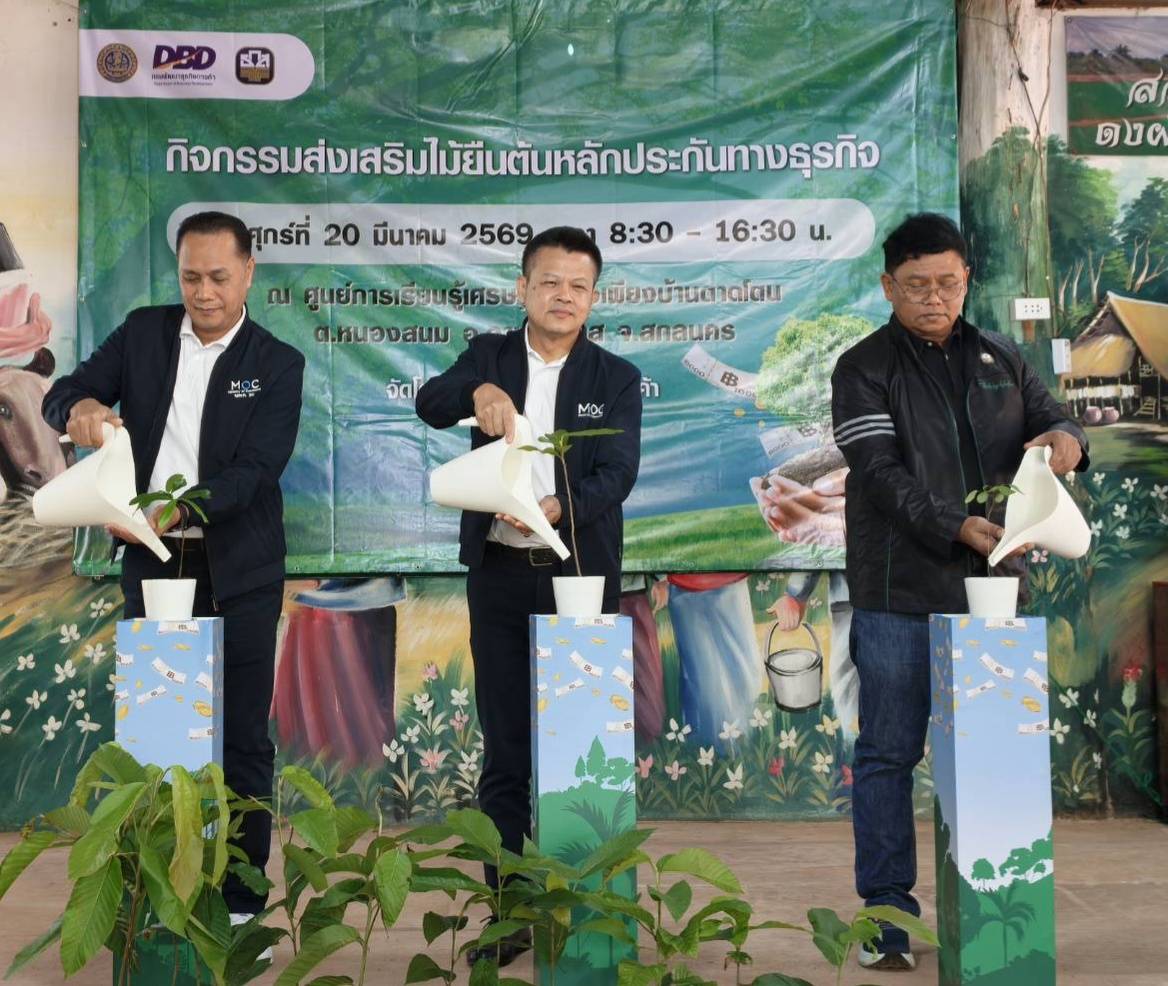 นายจิตรกร ว่องเขตกร รองอธิบดีกรมพัฒนาธุรกิจการค้า กระทรวงพาณิชย์ เผยว่า วันนี้ (20 มีนาคม 2569) ได้รับการมอบหมายจาก นายพูนพงษ์ นัยนาภากรณ์ อธิบดีกรมพัฒนาธุรกิจการค้า ให้เป็นประธานเปิดกิจกรรมส่งเสริมไม้ยืนต้นหลักประกันทางธุรกิจ ณ ศูนย์การเรียนรู้เศรษฐกิจพอเพียงบ้านตาดโตน ตำบลหนองสนม อำเภอวานรนิวาส จังหวัดสกลนคร เนื่องจากเป็นชุมชนต้นแบบที่เป็นแหล่งเรียนรู้ด้านการเกษตรและวิถีพึ่งตนเองตามหลักปรัชญาเศรษฐกิจพอเพียง มีการส่งเสริมการเกษตรทฤษฎีใหม่ พัฒนาชุมชนให้สามารถพึ่งพาตนเองได้ ลดรายจ่าย เพิ่มรายได้ และมีการบริหารจัดการในรูปแบบกลุ่ม เพื่อสร้างความยั่งยืน และที่สำคัญอำเภอวานรนิวาสยังเป็นอำเภอนำร่องของจังหวัดสกลนคร ที่ได้มีการนำไม้ยืนต้นมาจดทะเบียนสัญญาหลักประกันแล้ว จำนวน 3 สัญญา จำนวนต้นไม้ 144 ต้น วงเงินค้ำประกันจำนวน 1.7 ล้านบาท (1,716,579 บาท)