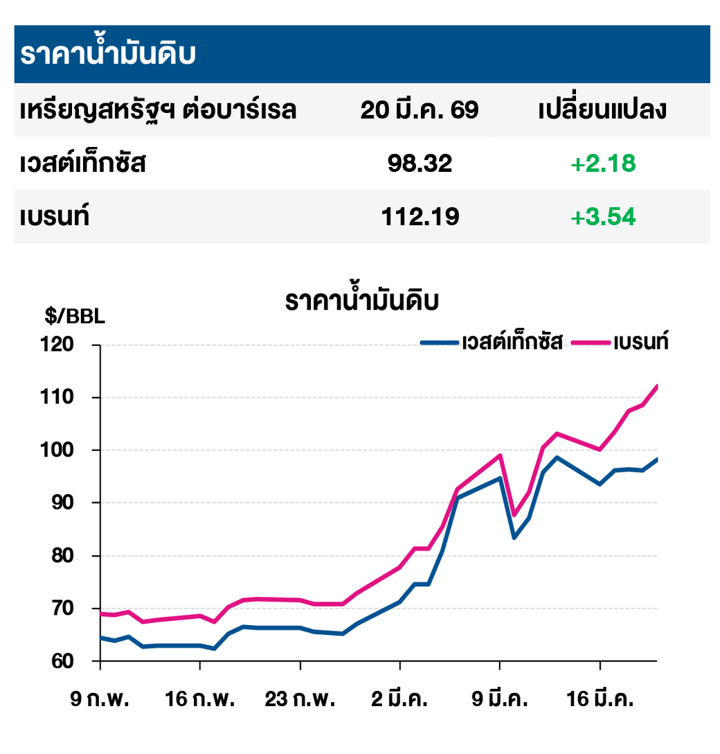 (-) ขณะที่มาตรการผ่อนคลายความกังวลด้านอุปทานน้ำมันดิบของสหรัฐฯ ยังคงดำเนินการต่อเนื่อง โดยล่าสุด นายสกอตต์ เบสเซนต์ รัฐมนตรีว่าการกระทรวงการคลังสหรัฐฯ ออกมาเปิดเผยว่าสหรัฐฯ ได้อนุญาตให้มีการจำหน่ายน้ำมันดิบและผลิตภัณฑ์ปิโตรเคมีของอิหร่านที่อยู่ระหว่างการขนส่งเป็นระยะเวลา 30 วัน จนถึงวันที่ 19 เม.ย. 69 โดยคาดการยกเว้นนี้จะส่งผลให้น้ำมันดิบเข้าสู่ตลาดโลกที่ระดับ 140 ล้านบาร์เรลต่อวัน