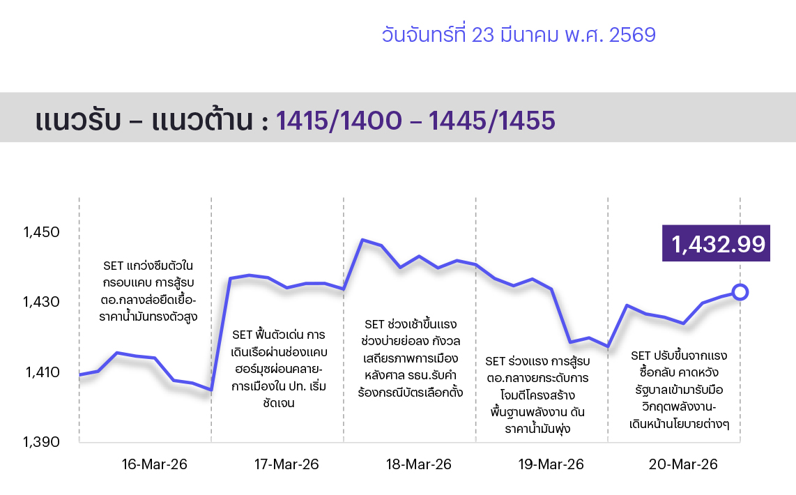 คาด SET แกว่งผันผวนทางลง การสู้รบในตะวันออกกลางตึงเครียดหลังอิหร่านระบุจะโจมตีโครงสร้างพื้นฐานด้านพลังงาน IT ระบบผลิตน้ำจืดของพันธมิตรสหรัฐในภูมิภาค ตอบโต้คำขู่สหรัฐฯ ที่จะถล่มโรงไฟฟ้าอิหร่าน หักล้างความหวังที่ ปธน.อิหร่านเสนอจัดตั้งโครงสร้างความมั่นคงเพื่อสร้างหลักประกันด้านสันติภาพ ขณะที่ปัจจัยในประเทศติดตามมาตรการป้องกันการขาดแคลนน้ำมันเชื้อเพลิง ทางเทคนิค ดัชนียังแกว่งผันผวน แนวรับ 1415/1400 แนวต้าน 1445/1455