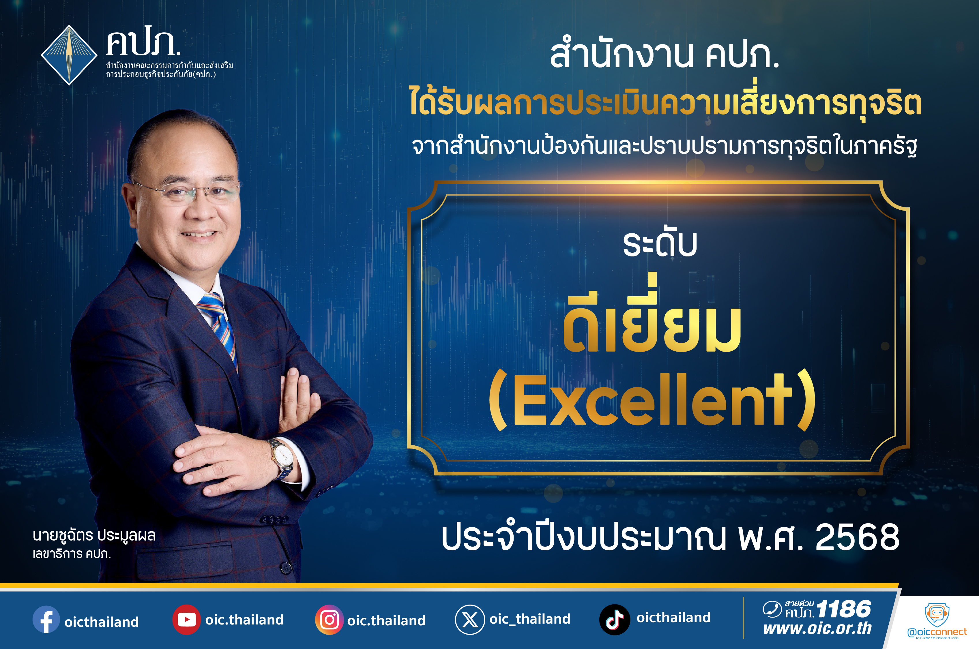 “ผลการประเมินระดับดีเยี่ยมนี้ เป็นเครื่องยืนยันถึงความตั้งใจของสำนักงาน คปภ. ในการดำเนินงานด้วยหลักธรรมาภิบาล โปร่งใส และยึดมั่นในค่านิยมสุจริต เพื่อพัฒนาการให้บริการประชาชนและภาคธุรกิจประกันภัยอย่างยั่งยืน”