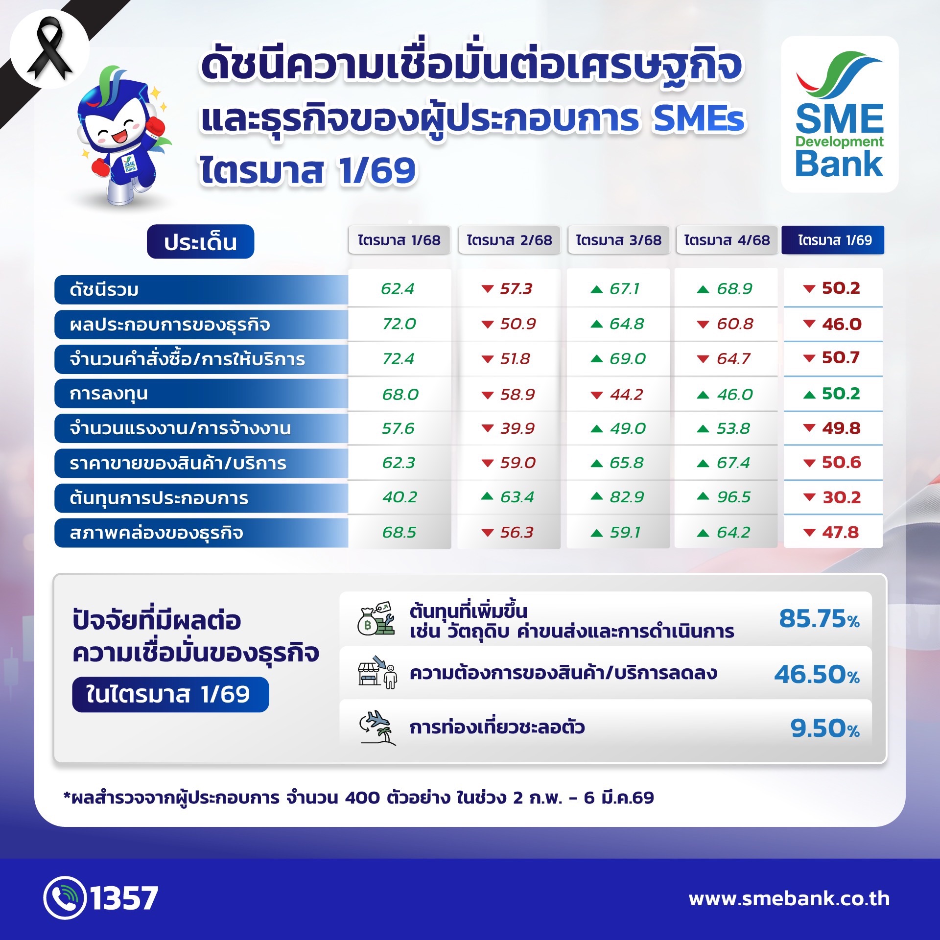 SME D Bank เปิดผลสำรวจดัชนีความเชื่อมั่นผู้ประกอบการเอสเอ็มอีทั่วประเทศ ประจำไตรมาส 1/2569 พบปรับลดลงอย่างรุนแรง เหลือระดับ 50.2 จากไตรมาส 4/68 ที่อยู่ระดับ 68.9 เหตุกังวลราคาน้ำมันและต้นทุนการผลิตที่เพิ่มสูงขึ้น กระทบคำสั่งซื้อและการดำเนินธุรกิจ ประกาศแผนช่วยหลือเต็มกำลัง สอดคล้องกับนโยบายรัฐบาล จัดสินเชื่อดอกเบี้ยต่ำ 3% ต่อปี วงเงินรวม 20,000 ล้านบาท ช่วยลดภาระต้นทุนธุรกิจ พร้อมส่งเสริมปรับเปลี่ยนใช้พลังงานสะอาด เสริมศักยภาพแข่งขัน และสร้างการเติบโตยั่งยืนในระยะยาว ขณะเดียวกัน ออกมาตรการลดการใช้พลังงานภายในองค์กร