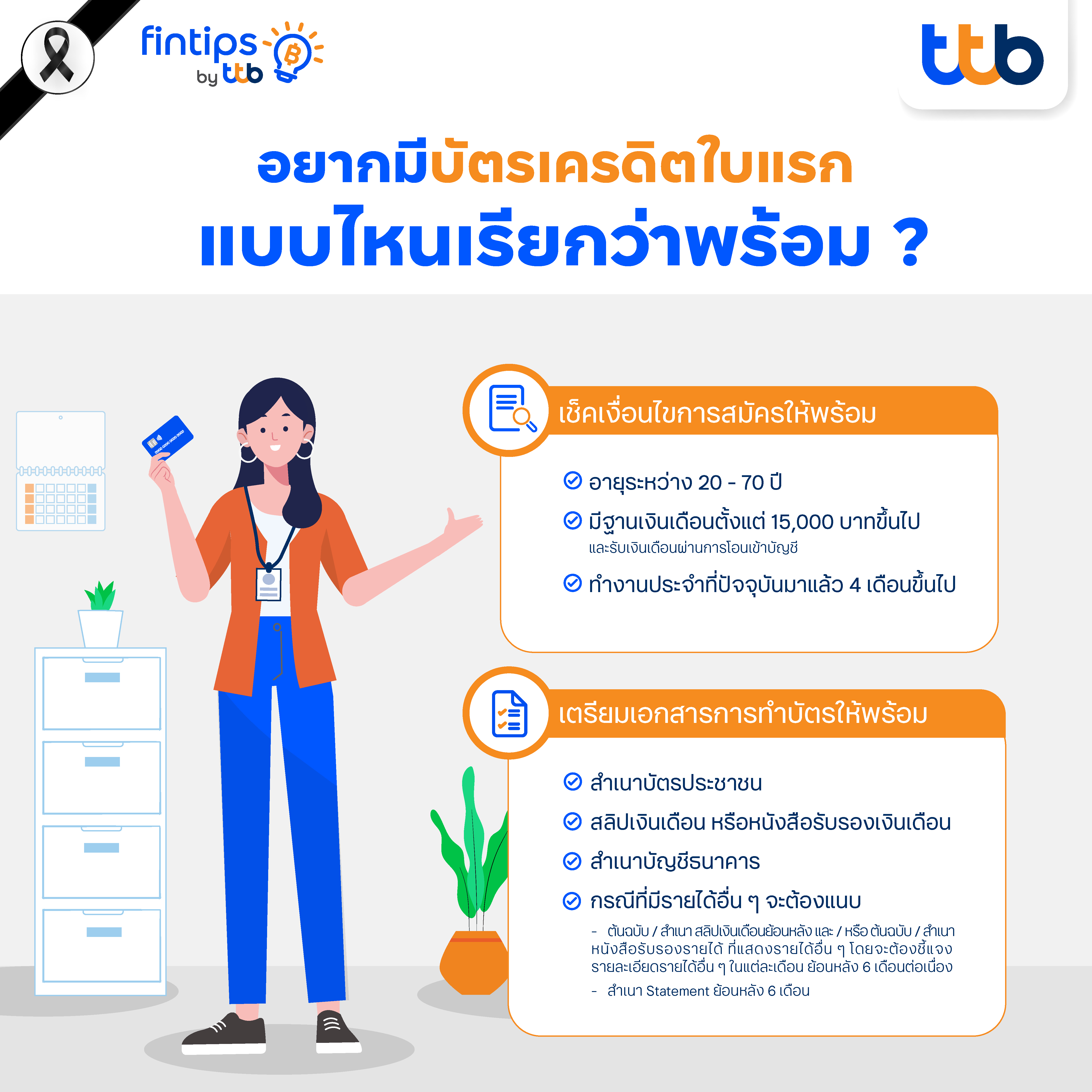 หลังเรียนจบ หนุ่มสาววัย Gen Z เริ่มต้นใช้ชีวิตวัยทำงานเป็น First Jobber ซึ่งหลายคนย่อมมองหาตัวช่วยด้านการเงินเพื่อวางแผนการใช้ชีวิตได้อย่างอิสระ เพราะรายจ่ายต่างๆ ไม่ว่าจะค่าที่พัก ค่าเดินทาง ค่ากินอยู่ในแต่ละวัน รวมไปถึงบิลค่าโทรศัพท์รายเดือน แม้กระทั่งค่าใช้จ่ายที่จำเป็นอย่างค่ารักษาพยาบาลที่อาจต้องใช้เมื่อเกิดเหตุฉุกเฉิน บัตรเครดิตจึงกลายเป็นตัวเลือกยอดนิยมของคน Gen Z ที่ต้องการบริหารรายจ่ายให้คล่องตัวขึ้น ทั้งช่วยผ่อนชำระโดยไม่ต้องใช้เงินก้อน และยังได้รับคะแนนสะสมหรือเงินคืนหากใช้ให้ถูกวิธี แต่เมื่อมีประเภทบัตรเครดิตให้เลือกมากมาย คำถามคือจะรู้ได้อย่างไรว่าบัตรใบไหนเหมาะกับไลฟ์สไตล์ของเรา วันนี้ fintips by ttb #เรื่องเงินที่รู้จริงแบบเพื่อนที่รู้ใจ จะพา First Jobber ไปเตรียมพร้อมก่อนทำบัตรเครดิตใบแรก เพื่อช่วยสร้างพื้นฐานทางการเงินที่มั่นคงตั้งแต่ก้าวแรกของการทำงาน