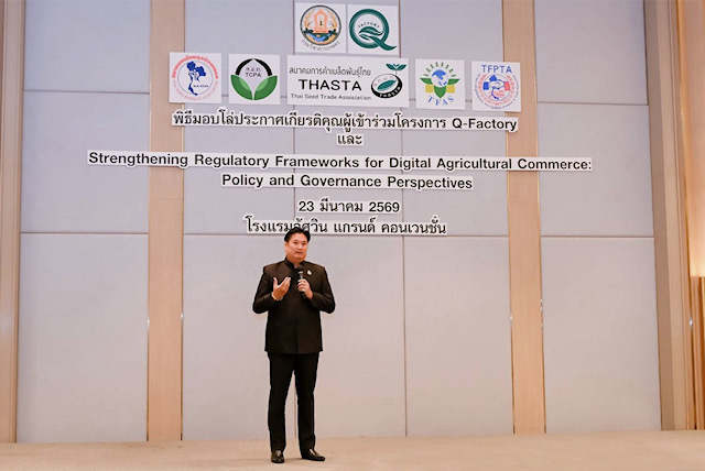 วันที่ 23 มีนาคม 2569 นายรพีภัทร์ จันทรศรีวงศ์ อธิบดีกรมวิชาการเกษตร เป็นประธานเปิดการเสวนาเรื่อง"การเสริมสร้างกรอบการกำกับดูแลการค้าสินค้าเกษตรดิจิทัล: มุมมองเชิงนโยบายและหลักธรรมาภิบาล" พร้อมมอบโล่ประกาศเกียรติคุณแก่ผู้ประกอบการในโครงการ Q-FACTORY ประจำปี 2568 ณ โรงแรมอัศวิน แกรนด์ คอนเวนชั่น กรุงเทพมหานคร โดยมีผู้บริหารจากหน่วยงานภาครัฐ ภาคเอกชน และภาคีเครือข่ายที่เกี่ยวข้องเข้าร่วมอย่างคับคั่ง