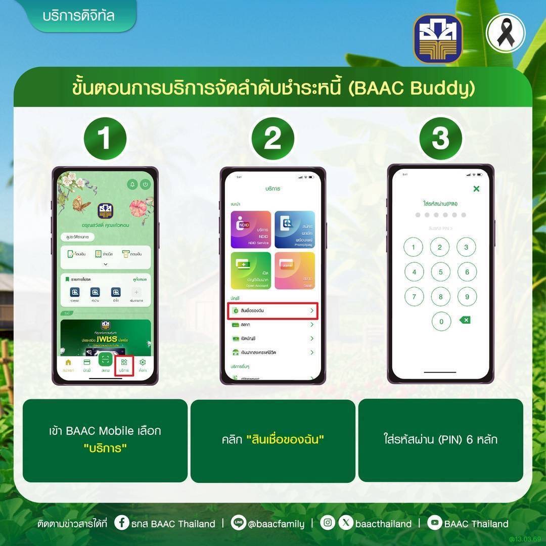 นายฉัตรชัย ศิริไล ผู้จัดการธนาคารเพื่อการเกษตรและสหกรณ์การเกษตร (ธ.ก.ส.) กล่าวว่า ธ.ก.ส. ได้นำเทคโนโลยีและนวัตกรรมฟีเจอร์ใหม่ผ่านแอปพลิเคชัน BAAC Mobile ภายใต้ชื่อ “BAAC Buddy” มาช่วยตอบโจทย์ของเกษตรกรที่มีหนี้หลายสัญญาและตรวจเช็คว่าหนี้สัญญาใดที่จะครบกำหนด พร้อมการแนะนำการชำระหนี้ของเกษตรกรที่จะได้รับประโยชน์สูงสุด ซึ่งนอกจากเป็นการรักษาวินัยทางการเงิน ที่เป็นการสร้างเครดิตให้กับลูกค้าแล้วยังช่วยในเรื่องของการลดภาระดอกเบี้ย และโอกาสในการรับสิทธิพิเศษจากโครงการต่าง ๆ ของรัฐที่เข้ามาสนับสนุน รวมถึงโปรโมชันที่ธนาคารจัดขึ้น ซึ่งฟีเจอร์ดังกล่าวจะทำให้เกษตรกรรับรู้สถานะหนี้ของตนเองได้ทุกที่ ทุกเวลา สะดวกสบาย และสามารถกำหนดลำดับความสำคัญของการชำระหนี้แต่ละบัญชีได้ด้วยตนเอง เช่น แผนการผ่อนชำระให้เหมาะสมกับกระแสเงินสดรับในแต่ละเดือน ไม่ว่าจะเป็นการเลือกชำระหนี้ก่อนครบกำหนด โดยระบบจะช่วยคำนวณและแนะนำแนวทางการชำระหนี้ที่เหมาะสมแบบเรียลไทม์ นอกจากนี้ ยังมาพร้อมเครื่องมือวิเคราะห์ ภาระหนี้โดยรวมของผู้ใช้งานแสดงภาพรวมของยอดคงค้าง อัตราดอกเบี้ย และระยะเวลาการชำระหนี้ เพื่อช่วยให้ลูกค้า สามารถตัดสินใจทางการเงินได้แบบมีข้อมูลรองรับ และยังช่วยลดค่าใช้จ่ายการเดินทาง เพราะสามารถชำระหนี้ผ่าน แอปพลิเคชัน BAAC Mobile ได้ทันที ทั้งกรณีชำระปกติ หรือชำระตามโปรโมชันที่ธนาคารกำหนด อาทิ “ชำระดีมีเงินคืน (Cash Back)” ภายใต้โครงการ ชำระดีมีโชค (สิ้นสุด 31 มีนาคม 2569) และแคมเปญ “BAAC Buddy จ่ายดี มีวินัยได้เงิน” (สิ้นสุด 30 เมษายน 2569) เป็นต้น