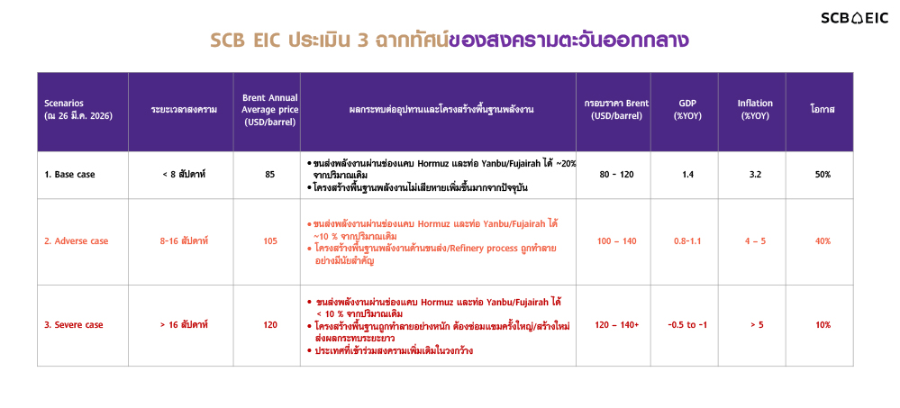 SCB EIC ประเมิน 3 ฉากทัศน์ของวิกฤตตะวันออกกลาง โดย 1) กรณีฐาน (Base) ความขัดแย้งจะจบลงภายใน 2 เดือน ราคาน้ำมัน Brent ทั้งปี 2026 จะเฉลี่ยอยู่ที่ 85 ดอลลาร์ต่อบาร์เรล 2) กรณีเลวร้าย (Adverse) ยืดเยื้อ 4 เดือน และมีการทำลายแหล่งผลิตและโครงสร้างพื้นฐานด้านพลังงานอย่างมีนัยสำคัญ ราคาน้ำมัน Brent ปี 2026 จะเฉลี่ยอยู่ที่ 105 ดอลลาร์ต่อบาร์เรล และ 3) กรณีรุนแรง (severe) ยืดเยื้อเกิน 4 เดือน สงครามขยายวงกว้าง มีประเทศในตะวันออกกลางที่เข้าร่วมสงครามมากขึ้น รวมถึงมีแหล่งผลิตและโครงสร้างพื้นฐานพลังงานถูกทำลายอย่างหนัก กรณีนี้ราคาน้ำมัน Brent เฉลี่ยทั้งปีนี้อาจสูงถึง 120 ดอลลาร์ต่อบาร์เรล นอกจากราคาพลังงานโลกพุ่งขึ้นแรง สงครามนี้จะทำให้ต้นทุนขนส่งทางบก ทางทะเล และทางอากาศเร่งตัวและผันผวนสูง วิกฤตพลังงานครั้งนี้จึงมีแนวโน้มส่งผลกระทบเป็นวงกว้างกว่าวิกฤตพลังงานในอดีต โดยกำลังขยายผลวงกว้างเป็น “วิกฤตสองทาง” ทั้งจากสินค้าพลังงานและจากการขาดแคลนสินค้าต้นน้ำของอุตสาหกรรมสำคัญบางชนิด เช่น เม็ดพลาสติก ปุ๋ย ยา และโลหะ
