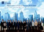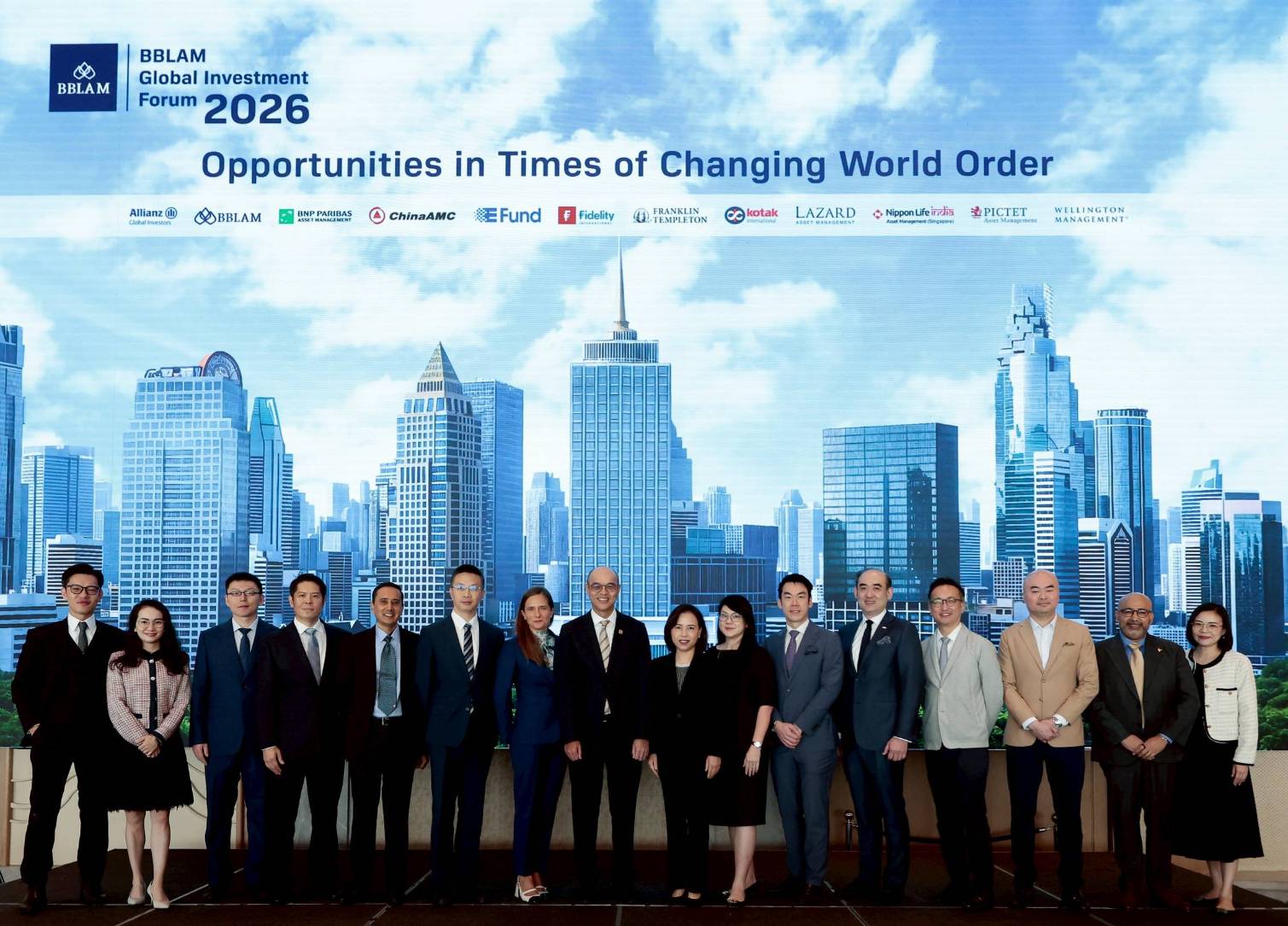นายบรรณรงค์ พิชญากร (คนที่ 8 จากซ้าย) ประธานเจ้าหน้าที่บริหาร พร้อมด้วย ดร.ธนาวุฒิ พรโรจนางกูร (คนที่ 4 จากซ้าย) ประธานเจ้าหน้าที่การลงทุน บริษัทหลักทรัพย์จัดการกองทุนรวม บัวหลวง จำกัด หรือ BBLAM ให้การต้อนรับ นางสาว วรพร วิทยะสิรินันท์ (คนที่ 8 จากขวา) ผู้ช่วยผู้จัดการใหญ่ Wealth & Private Bank ธนาคารกรุงเทพ จำกัด (มหาชน) และทีมผู้เชี่ยวชาญการลงทุน จาก 11 บริษัทจัดการกองทุนระดับโลก ที่ให้เกียรติเข้าร่วมถ่ายทอดแนวโน้มเศรษฐกิจมหภาค ภูมิรัฐศาสตร์ และโอกาสใหม่ของการลงทุนในปี 2026 แก่นักลงทุนไทย ภายในงานฟอรั่มประจำปี “BBLAM Global Investment Forum 2026” ซึ่งจัดขึ้น ณ รร.ดุสิตธานี กรุงเทพฯ