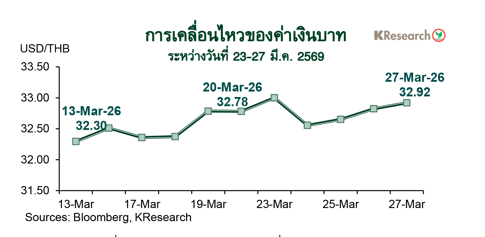 · สัปดาห์ระหว่างวันที่ 30 มี.ค.-3 เม.ย. 2569 ธนาคารกสิกรไทยมองกรอบการเคลื่อนไหวของค่าเงินบาทที่ระดับ 32.10-33.10 บาทต่อดอลลาร์ฯ ขณะที่ศูนย์วิจัยกสิกรไทยประเมินปัจจัยสำคัญที่ต้องติดตาม ได้แก่ รายงานเศรษฐกิจและการเงินเดือนก.พ. ของไทย สถานการณ์ในตะวันออกกลาง ทิศทางราคาน้ำมันในตลาดโลก ฟันด์โฟลว์ของต่างชาติและสัญญาณเกี่ยวกับแนวโน้มดอกเบี้ยจากถ้อยแถลงของเจ้าหน้าที่เฟด