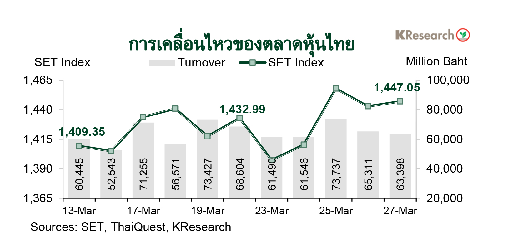 · ในวันศุกร์ที่ 27 มี.ค. 2569 ดัชนี SET ปิดที่ระดับ 1,447.05 จุด เพิ่มขึ้น 0.98% จากระดับปลายสัปดาห์ก่อน ขณะที่มูลค่าการซื้อขายเฉลี่ยต่อวันอยู่ที่ 65,096.46 ล้านบาท เพิ่มขึ้น 0.96% จากสัปดาห์ก่อน ส่วนดัชนี mai ลดลง 0.73% มาปิดที่ระดับ 217.47 จุด