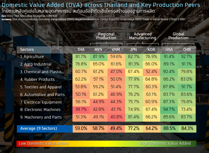 เมื่อเปรียบเทียบกับกลุ่ม Regional Production ซึ่งเป็นคู่แข่งโดยตรงของไทย พบว่าไทยมีระดับ DVA ใกล้เคียงกับมาเลเซีย และสูงกว่าเวียดนามในบางอุตสาหกรรม อย่างไรก็ตาม โครงสร้างดังกล่าวยังไม่สะท้อนความได้เปรียบด้านการสร้างมูลค่าเพิ่มภายในประเทศเมื่อเทียบกับคู่แข่งโดยตรงอย่างชัดเจน