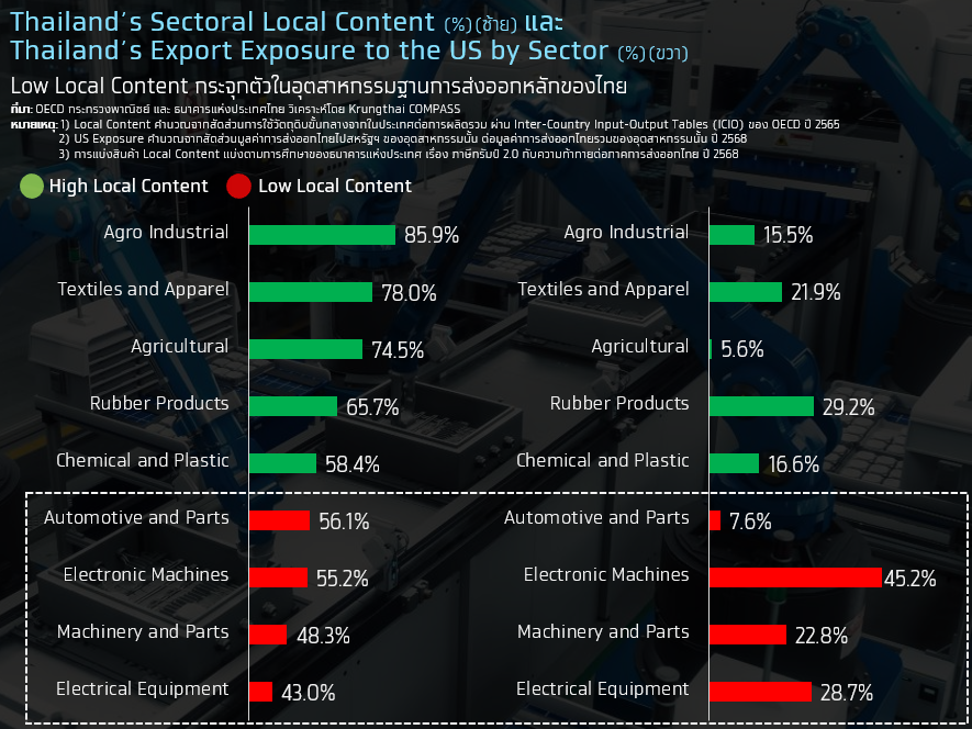 • Krungthai COMPASS ประเมินว่า ความเสี่ยงนี้มีนัยสำคัญต่อไทย เพราะอุตสาหกรรมส่งออกหลักบางส่วนพึ่งพาวัตถุดิบนำเข้าในสัดส่วนสูง แม้การส่งออกอาจขยายตัวได้ในระยะสั้น แต่ภายใต้กติกาการค้าโลกที่ให้น้ำหนักกับกฎถิ่นกำเนิดมากขึ้น จุดแข็งด้านต้นทุนหรือคำสั่งซื้อเพียงอย่างเดียวอาจไม่เพียงพออีกต่อไป โดยแรงกดดันมีแนวโน้มกระจุกตัวในกลุ่ม Low Local Content และพึ่งพาตลาดสหรัฐฯ สูง โดยเฉพาะเครื่องจักร อุปกรณ์ไฟฟ้า และอิเล็กทรอนิกส์ ซึ่งมีบทบาทสำคัญต่อการส่งออกไทย