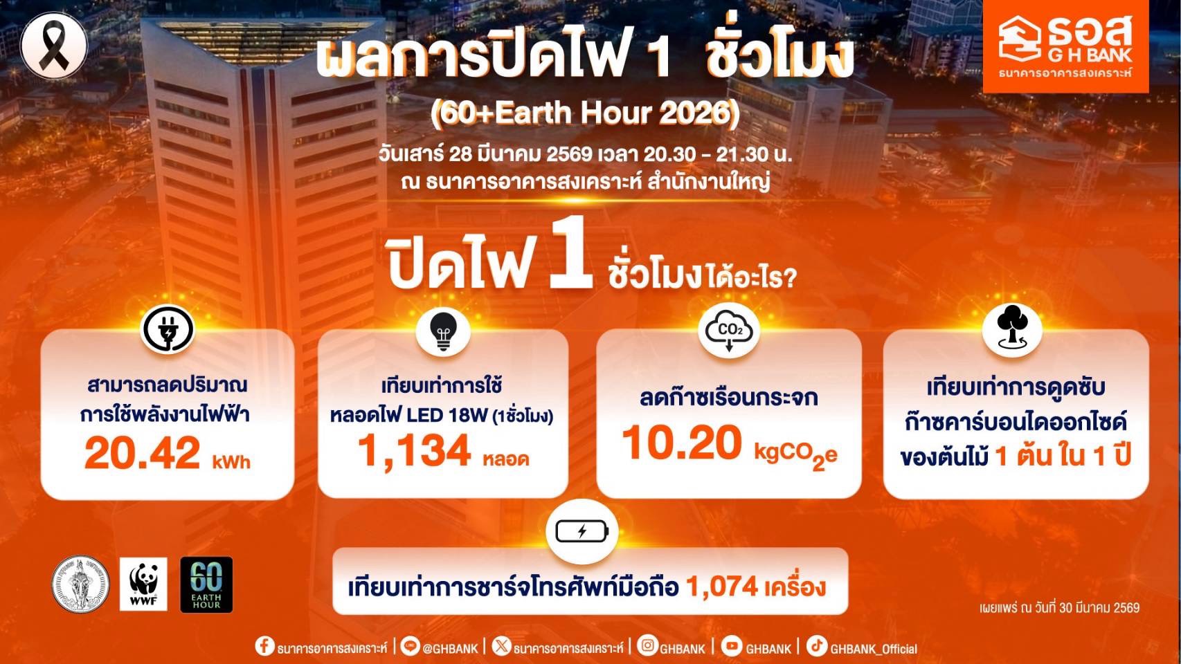 ธนาคารอาคารสงเคราะห์ (ธอส.) ร่วมรณรงค์การลดภาวะโลกร้อน (Climate Change) โดยการปิดไฟที่ไม่จำเป็น 1 ชั่วโมง พร้อมกันทั่วโลก ซึ่งสอดคล้องกับนโยบายรัฐบาลในการประหยัดการใช้พลังงานและการลดก๊าซเรือนกระจก ธนาคารจึงจัดกิจกรรมปิดไฟ 1 ชั่วโมง (60+ Earth Hour 2026) เมื่อวันเสาร์ที่ 28 มีนาคม 2569 เวลา 20.30 - 21.30 น. ณ ธนาคารอาคารสงเคราะห์ สำนักงานใหญ่ โดยกิจกรรมดังกล่าว สามารถลดปริมาณการใช้ไฟฟ้าได้ถึง 20.42 kWh เทียบเท่าการใช้หลอดไฟ LED 18W จำนวน 1,134 หลอด สามารถลดก๊าซเรือนกระจก 10.20 kgCO2e เทียบเท่าการดูดซับก๊าซคาร์บอนไดออกไซด์ของต้นไม้ 1 ต้น ใน 1 ปี เทียบเท่ากับการชาร์จโทรศัพท์มือถือ ถึงจำนวน 1,074 เครื่อง ทั้งนี้ การจัดการกิจกรรมปิดไฟ 1 ชั่วโมง เป็นส่วนหนึ่งของการขับเคลื่อนองค์กรสู่ความยั่งยืน ควบคู่กับการสร้างความตระหนักรู้ด้านสิ่งแวดล้อม และการมีส่วนร่วมในการลดผลกระทบจากการเปลี่ยนแปลงสภาพภูมิอากาศอย่างต่อเนื่อง