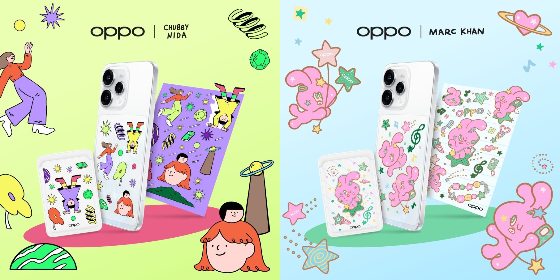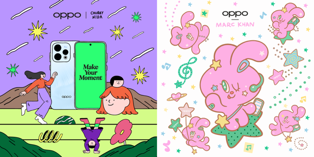 ความพิเศษในครั้งนี้ OPPO ได้จับมือกับ 2 ศิลปินไทย ได้แก่ คุณนิดา - Chubbynida เจ้าของคาแรกเตอร์เด็กหญิงผมแดงสุดยูนีคกับลายเส้นที่เป็นเอกลักษณ์ และ คุณมาร์ค - MARC KHAN เจ้าของคาแรกเตอร์กระต่ายสีชมพูที่โดดเด่นด้วยสไตล์สดใสขี้เล่น มาร่วมสร้างสรรค์ผลงานคอลแลปภายใต้ธีม “Young & Free” ที่ถ่ายทอดความสดใส และความรู้สึกเป็นอิสระในแบบของคนรุ่นใหม่ได้อย่างลงตัว
