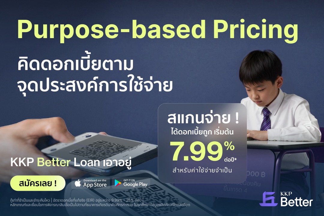 *อัตราดอกเบี้ยที่แท้จริง (EIR) อยู่ระหว่าง 7.99% - 25% ต่อปี เงื่อนไขเป็นไปตามที่ธนาคารกำหนด ศึกษาข้อมูลเพิ่มเติมได้ที่: https://kkpbetter.kkpfg.com/th/loan-products/personal-loan/kkp-better-loan