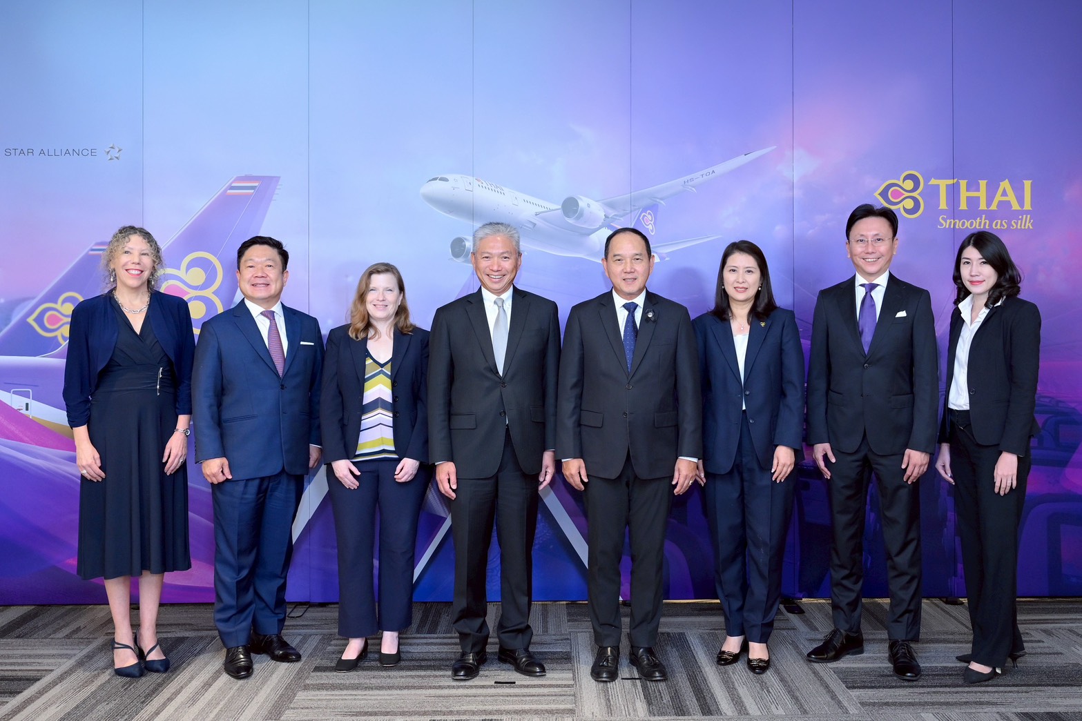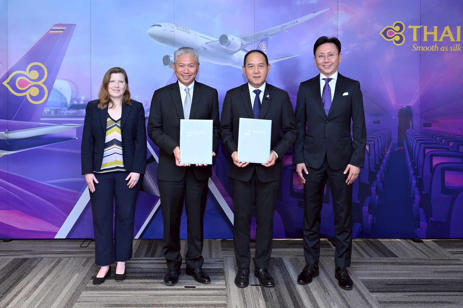 นายชาย เอี่ยมศิริ ประธานเจ้าหน้าที่บริหาร บริษัท การบินไทย จำกัด (มหาชน) นางเฉิดโฉม เทอดสถีรศักดิ์ ประธานเจ้าหน้าที่สายการเงินและการบัญชี บริษัท การบินไทยฯ และนายฉี ชิง-ฟู่ ประธานเจ้าหน้าที่บริหารและกรรมการผู้จัดการ ธนาคารแลนด์ แอนด์ เฮ้าส์ จำกัด (มหาชน) หรือ LH Bank ร่วมกันลงนามความร่วมมือ เรื่อง การใช้ผลิตภัณฑ์ “เงินฝากสีเขียว” พร้อมทั้ง Ms. Christine Engstrom, Director General, Sectors Department 3 ธนาคารพัฒนาเอเชีย (ADB) และ นายสมบัติ จิวะริยาเวช ประธาน บริษัท ทริสเรทติ้ง จำกัด ร่วมเป็นสักขีพยาน ณ สำนักงานใหญ่ การบินไทย ถนนวิภาวดีรังสิต
