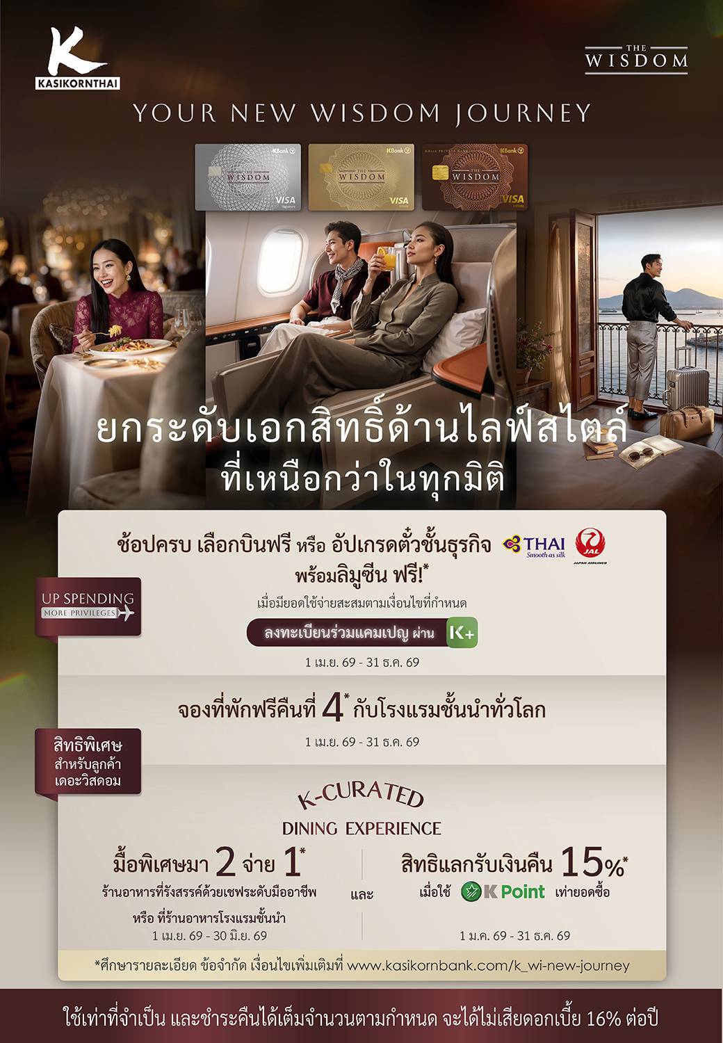 เดอะวิสดอมกสิกรไทย* (KBank THE WISDOM) เดินหน้าสู่ก้าวใหม่ของการยกระดับสิทธิพิเศษด้วยบัตรเครดิตเดอะวิสดอมกสิกรไทย ภายใต้แนวคิด "Your New WISDOM Journey" พร้อมอัปเกรดประสบการณ์ให้ตอบโจทย์ไลฟ์สไตล์ที่หลากหลายและมีความหมายยิ่งขึ้น จับมือกับ วีซ่า (Visa) มอบประสบการณ์เอ็กซ์คลูซีฟ ครอบคลุมทั้งการเดินทาง การพักผ่อน และการใช้ชีวิตระดับลักชูรี ผ่านแคมเปญ “UP SPENDING, MORE PRIVILEGES” ลูกค้าสามารถเปลี่ยนทุกการใช้จ่ายผ่านบัตรเครดิตเดอะวิสดอมกสิกรไทยให้เป็นประสบการณ์เอ็กซ์คลูซีฟ ครอบคลุมทั้งเลือกตั๋วเครื่องบิน หรือเลือกอัปเกรดสู่ชั้นธุรกิจ พร้อมบริการลิมูซีนรับ-ส่ง รวมถึงสิทธิพิเศษด้านการท่องเที่ยวและไลฟ์สไตล์ อาทิ พักฟรีคืนที่ 4 ในโรงแรมระดับเวิลด์คลาสทั่วโลก และประสบการณ์มื้ออาหารเอ็กซ์คลูซีฟกับ K-Curated Dining Experience พร้อมสิทธิพิเศษมา 2 จ่าย 1 และแลก K Point รับเครดิตเงินคืนสูงสุด 15% ระหว่างวันที่ 1 เมษายน 2569 – 31 ธันวาคม 2569