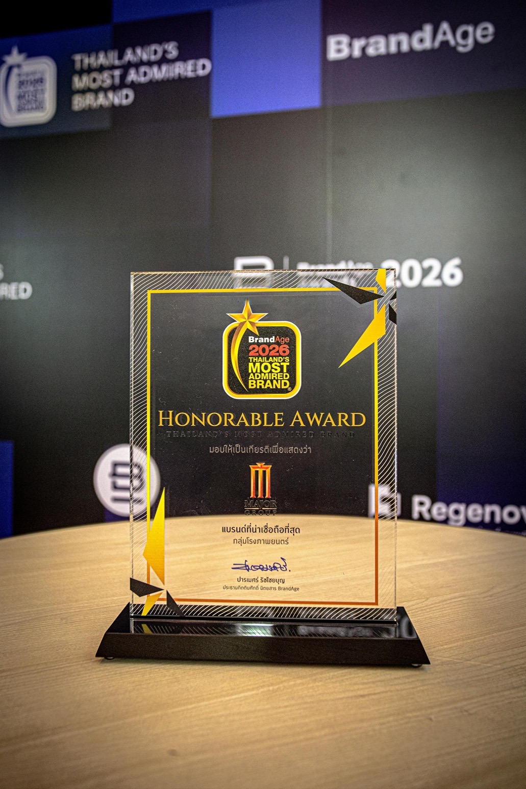 บริษัท เมเจอร์ ซีนีเพล็กซ์ กรุ้ป จำกัด (มหาชน) ตอกย้ำความเป็นผู้นำอุตสาหกรรมธุรกิจโรงภาพยนตร์ของประเทศไทย คว้ารางวัลอันดับ 1 ในใจผู้บริโภคจากผลสำรวจ "2026 Thailand's Most Admired Brand" ในกลุ่มโรงภาพยนตร์ต่อเนื่องเป็นปีที่ 5 สะท้อนความแข็งแกร่งของแบรนด์ที่ปรับตัวเข้ากับยุคสมัย และการสร้างประสบการณ์ความบันเทิงที่เหนือระดับอย่างไม่หยุดนิ่ง