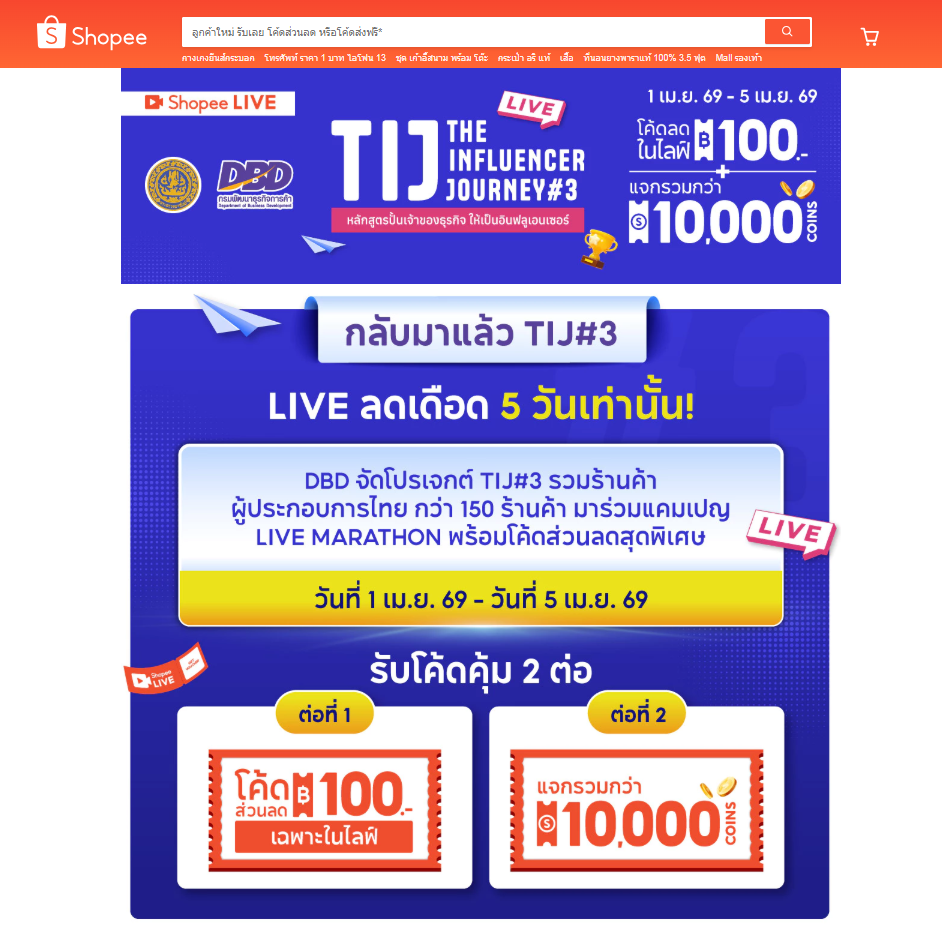 กรมพัฒนาธุรกิจการค้า เดินหน้าปั้นผู้ประกอบการไทยสู่อินฟลูเอนเซอร์ รุ่นใหม่ ที่ผ่านการคัดเลือก จำนวน 150 ร้านค้า ในหลักสูตร The Influencer Journey รุ่นที่ 3 เพื่อเข้าร่วมกิจกรรม LIVE Marathon ขายสินค้าระหว่างวันที่ 1 - 10 เมษายน 2569 ผ่าน 3 แพลตฟอร์มชั้นนำอย่าง Shopee TikTok และ NexGen Commerce พร้อมด้วยโปรโมชัน โคดส่วนลด คูปองส่งฟรี จัดหนัก เน้นกระตุ้นยอดขาย สร้างโอกาสขยายตลาดออนไลน์และเพิ่มรายได้อย่างเป็นรูปธรรม