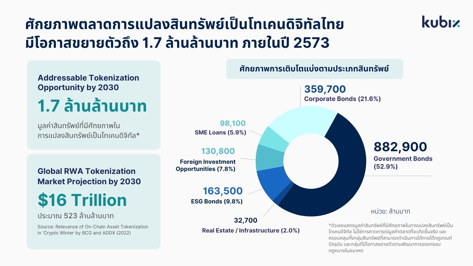 นางสาวอัศวิณี ศรีสมบูรณานนท์ กรรมการผู้จัดการ บริษัท คิวบิกซ์ ดิจิทัล แอสเสท จำกัด (Kubix) เปิดเผยว่า ตลาดการแปลงสินทรัพย์เป็นโทเคนดิจิทัล (RWA Tokenization) ทั่วโลกมีแนวโน้มการเติบโตอย่างต่อเนื่อง โดยมีการคาดการณ์มูลค่าตลาดรวมที่อาจขยับเพิ่มขึ้นถึง 16 ล้านล้านดอลลาร์สหรัฐ (530 ล้านล้านบาท) ภายในปี 2573 สะท้อนให้เห็นว่าการนำสินทรัพย์ในโลกปัจจุบันมาบริหารจัดการบนระบบดิจิทัลกำลังกลายเป็นแนวทางมาตรฐานใหม่ของตลาดทุนสากล Kubix จึงได้ร่วมกับโอนิกิริ แคปิทัล (Onigiri Capital) กองทุนร่วมลงทุนในเครือเซซง แคปิทัล (Saison Capital) หน่วยงานด้านการลงทุนของกลุ่มบริษัทเครดิต เซซง ประเทศญี่ปุ่น เผยแพร่รายงานวิจัยเชิงลึก “Project Thara: Institutionalizing Real-World Asset Tokenization-Where Thailand’s Real Economy Meets Digital Capital” เพื่อวิเคราะห์โอกาสและศักยภาพของการยกระดับการแปลงสินทรัพย์ในโลกจริงเป็นโทเคนดิจิทัลในระดับสถาบัน