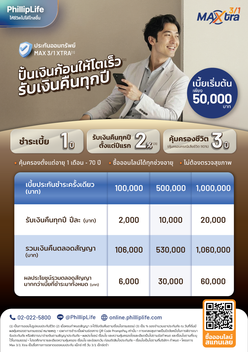 นายธฤทธิ์ พรหมนารถ ประธานเจ้าหน้าที่บริหาร ฟิลลิปไลฟ์ประกันชีวิต กล่าวว่า “ในยุคที่ความไม่แน่นอนทางเศรษฐกิจกลายเป็นปัจจัยสำคัญในการตัดสินใจทางการเงิน ลูกค้าจำนวนมากมองหาผลิตภัณฑ์ที่สามารถให้ทั้งความมั่นคงและความยืดหยุ่น “Max 3/1 Xtra” จึงถูกออกแบบมาเพื่อตอบโจทย์ดังกล่าว โดยเฉพาะกลุ่มคนวัยทำงาน เจ้าของธุรกิจ และนักลงทุน ที่ต้องการบริหารเงินในระยะสั้น แต่ยังคงได้รับผลตอบแทนที่ชัดเจน พร้อมความคุ้มครองชีวิตในเวลาเดียวกัน เราเชื่อว่าผลิตภัณฑ์นี้จะช่วยให้ลูกค้าสามารถวางแผนการเงินได้อย่างมั่นใจมากยิ่งขึ้น”