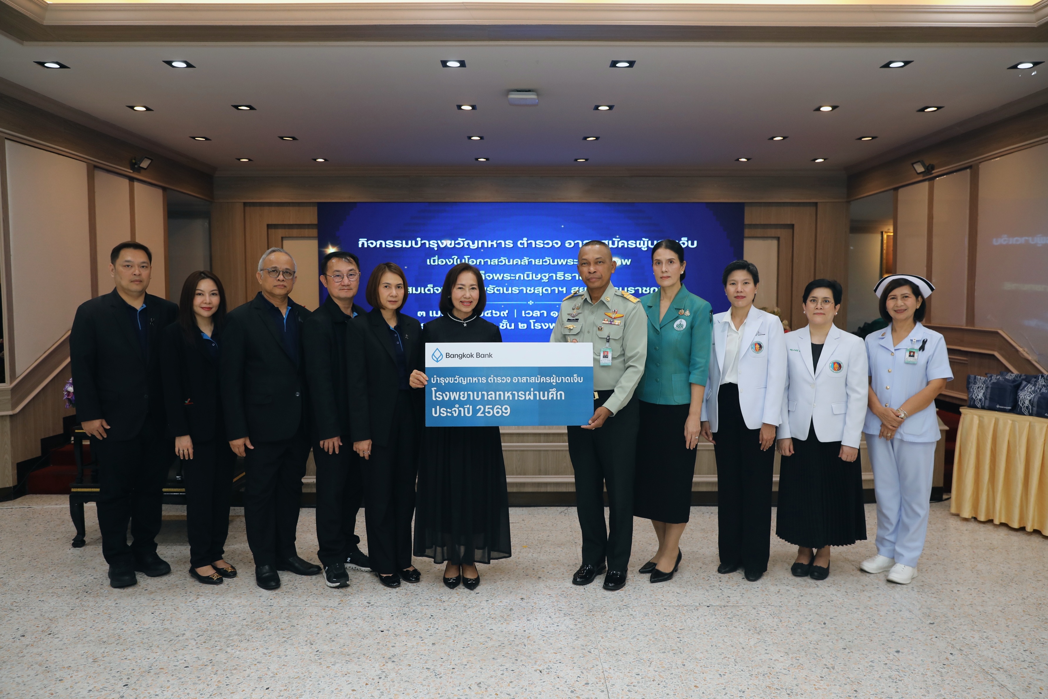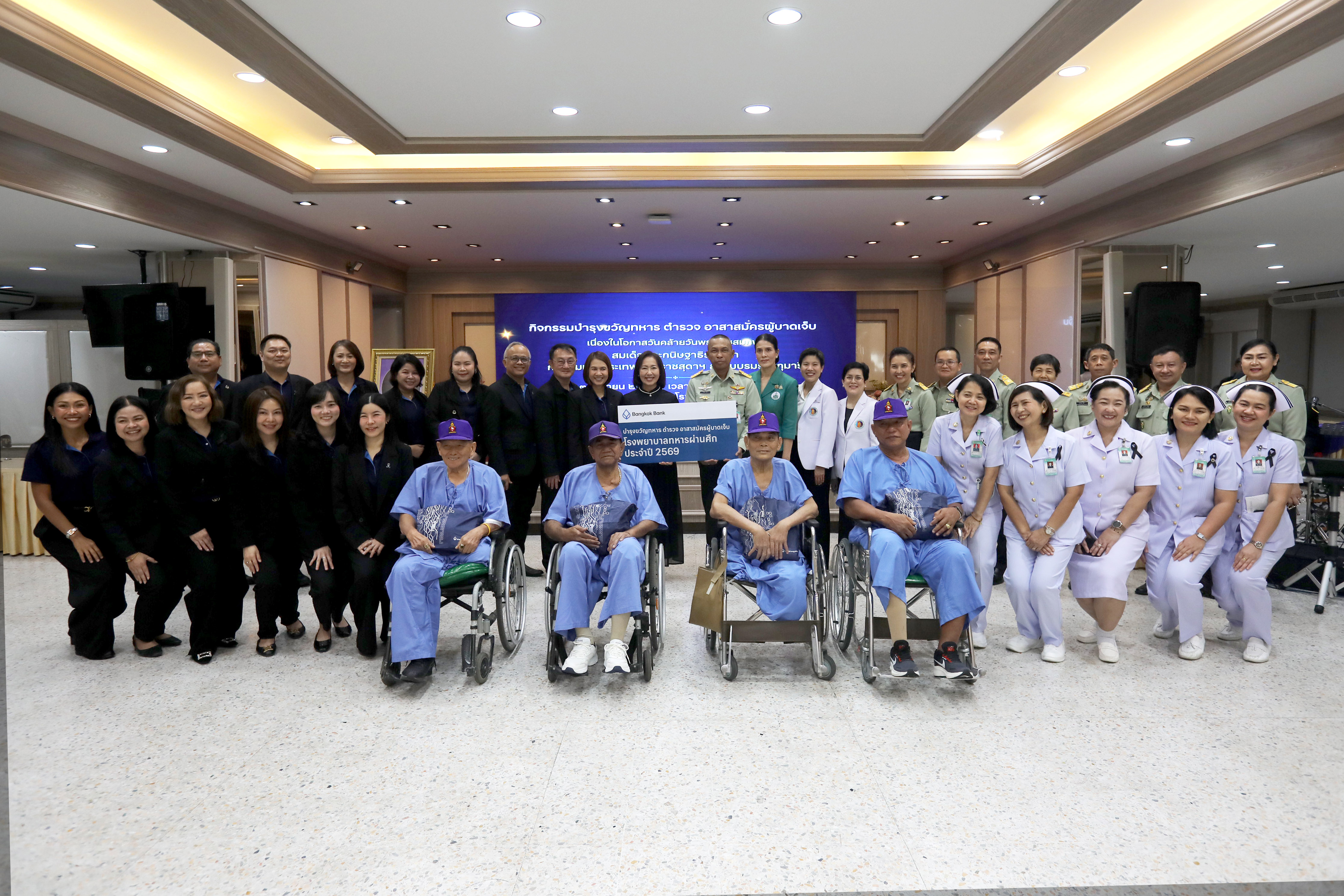 ส่งต่อความห่วงใย ไม่เคยเปลี่ยน - นางสาวพจณี คงคาลัย ผู้ช่วยผู้จัดการใหญ่ นายอภิวัฒน์ ปุณโณปกรณ์ เจ้าหน้าที่บริหารระดับ Vice President ผู้จัดการฝ่ายการประชาสัมพันธ์ นายสุวิทย์ อินทรเฉลิม เจ้าหน้าที่บริหารระดับ Vice President ฝ่ายการประชาสัมพันธ์ และ นางนฤมล เข็มวิลาศ เจ้าหน้าที่บริหารระดับ Assistant Vice President ผู้จัดการภาคนครหลวง 5 นำคณะผู้บริหารและพนักงาน ธนาคารกรุงเทพ จำกัด (มหาชน) สานต่อพันธกิจ “เพื่อนคู่คิด มิตรคู่บ้าน” ส่งมอบความสุขและพลังใจให้แก่ผู้ป่วยทหาร ตำรวจ และอาสาสมัคร ต่อเนื่องเป็นปีที่ 37 เพื่อถวายเป็นพระราชกุศลและเฉลิมพระเกียรติ สมเด็จพระกนิษฐาธิราชเจ้า กรมสมเด็จพระเทพรัตนราชสุดา ฯ สยามบรมราชกุมารี เนื่องในโอกาสวันคล้ายวันพระราชสมภพ โดยมี นายธีระยุทธ ศิริคำ ผู้ช่วยผู้อำนวยการองค์การสงเคราะห์ทหารผ่านศึก (ฝ่ายบริหาร) นางแสงเดือน ศิริคำ อุปนายกสมาคมแม่บ้านองค์การสงเคราะห์ทหารผ่านศึก และ แพทย์หญิงจิตติมา ปรีชา ผู้อำนวยการโรงพยาบาลทหารผ่านศึก ร่วมให้การต้อนรับ ณ โรงพยาบาลทหารผ่านศึก เมื่อวันที่ 3 เมษายน 2569