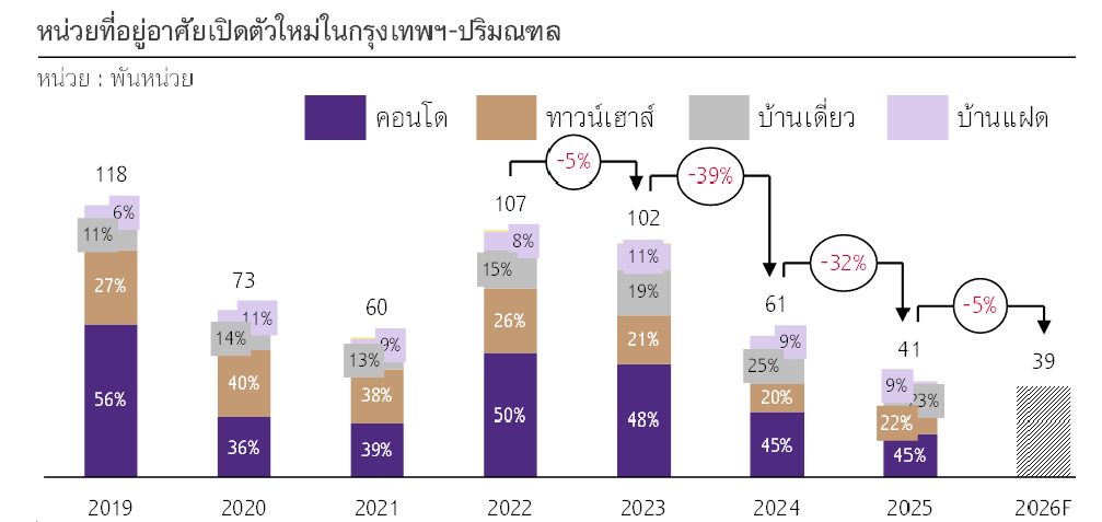 ผู้ประกอบการใช้กลยุทธ์ระบายที่อยู่อาศัยคงเหลือ และระมัดระวังการเปิดโครงการใหม่ โดย SCB EIC คาดว่าในปี 2569 จะมีการเปิดตัวโครงการที่อยู่อาศัยใหม่ในกรุงเทพฯ และปริมณฑลราว 39,000 หน่วย ลดลง -5%YOY โดยเป็นการหดตัวต่อเนื่องเป็นปีที่ 4 และกรณีสงครามยืดเยื้อ มีความเสี่ยงที่จะหดตัวลงถึง -10%YOY ซึ่งการลดลงของอุปทานใหม่ ส่งผลให้หน่วยเหลือขายสะสมในกรุงเทพฯ-ปริมณฑลปี 2569 มีแนวโน้มลดลงต่อเนื่องเป็นปีที่ 2 มาอยู่ที่ราว 212,000 หน่วย (-4%YOY) ทั้งนี้การเปิดตัวโครงการใหม่ต้องเตรียมรับมือกับภาวะต้นทุนวัสดุก่อสร้างพุ่งสูงขึ้น จากสงครามตะวันออกกลาง ขณะที่กำลังซื้อยังไม่สามารถฟื้นตัวได้ กดดันให้ผู้ประกอบการไม่สามารถปรับขึ้นราคาที่อยู่อาศัยได้มากนัก และกระทบต่ออัตรากำไรตามมา