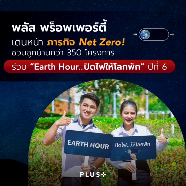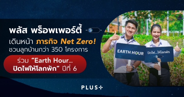 บริษัท พลัส พร็อพเพอร์ตี้ จำกัด ผู้นำด้านการบริหารจัดการอสังหาริมทรัพย์และการอยู่อาศัยครบวงจร เดินหน้าสานต่อพันธกิจด้านสิ่งแวดล้อม ผ่านกิจกรรม "Earth Hour ปิดไฟ...ให้โลกพัก" ต่อเนื่องเป็นปีที่ 6 เชิญชวนลูกบ้านในโครงการที่ดูแลกว่า 350 โครงการทั่วประเทศ ร่วมปิดไฟและเครื่องใช้ไฟฟ้าที่ไม่จำเป็น ระยะเวลา 1 ชั่วโมง เพื่อร่วมกันประหยัดพลังงาน