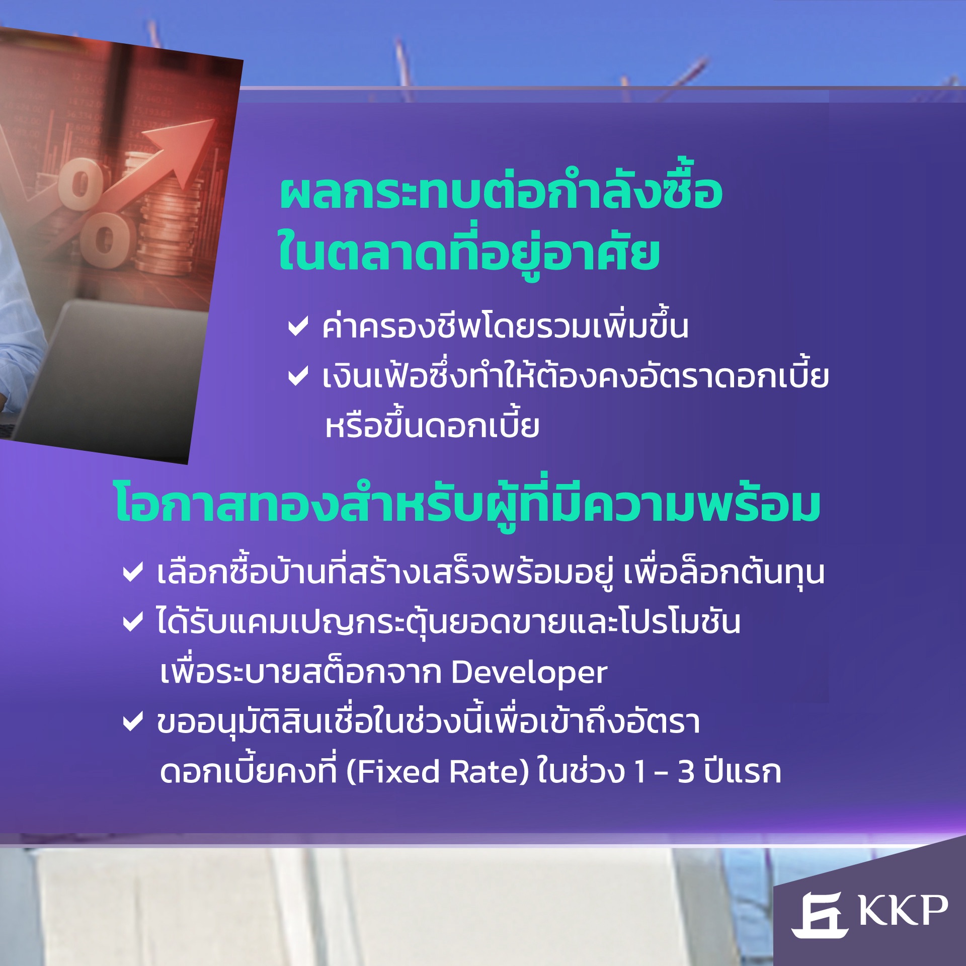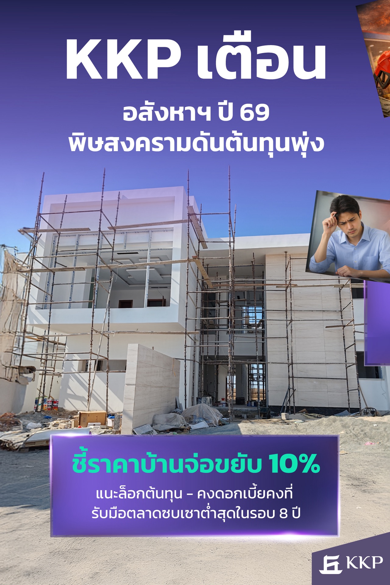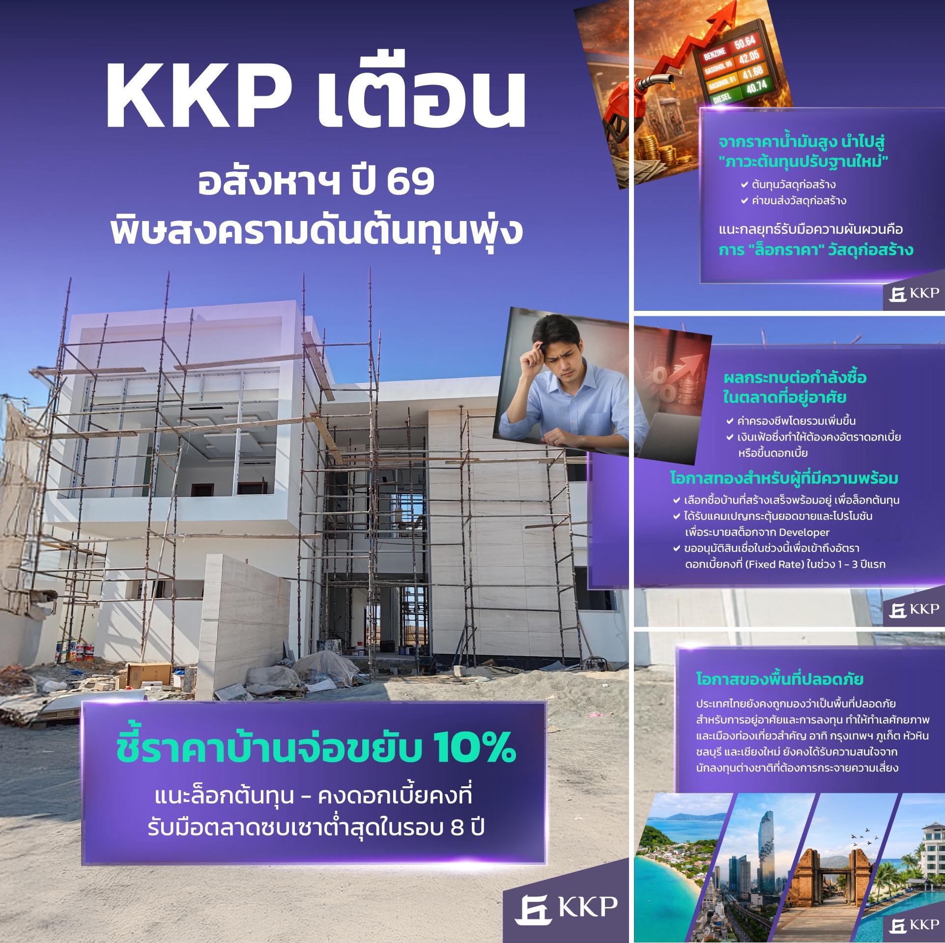 สายงานสินเชื่อธุรกิจ ธนาคารเกียรตินาคินภัทร (KKP) วิเคราะห์ตลาดอสังหาริมทรัพย์ไทยปี 2569 โดยคาดการณ์ว่ายอดโอนกรรมสิทธิ์ทั่วประเทศหดตัวเหลือ 290,000 ยูนิต จาก 316,214 หน่วยในปี 2568 ซึ่งถือเป็นระดับต่ำสุดในรอบ 8 ปี โดยมีสาเหตุจากราคาน้ำมันที่เพิ่มสูงขึ้นตามสถานการณ์ความตึงเครียดในตะวันออกกลาง ผลักดันให้ต้นทุนวัสดุก่อสร้างพุ่งตาม นำไปสู่ "ภาวะต้นทุนปรับฐานใหม่" (New Cost Base) กดดันบ้านโครงการใหม่ต้องปรับราคาขายขึ้นร้อยละ 5-10 ส่งผลให้ตลาดโครงการระดับกลาง-ล่างเผชิญภาวะชะลอตัวอย่างหนัก แนะผู้ประกอบการเร่ง "ล็อกราคาวัสดุ" และบริหารสภาพคล่องผ่านการระบายสต็อกเดิม ขณะที่ฝั่งผู้บริโภคถือเป็น “นาทีทอง” ในการคว้าบ้านต้นทุนเดิมและล็อกดอกเบี้ยคงที่ เพื่อสร้างเกราะป้องกันความเสี่ยงจากภาวะเงินเฟ้อและดอกเบี้ยขาขึ้นที่กำลังจะมาถึง