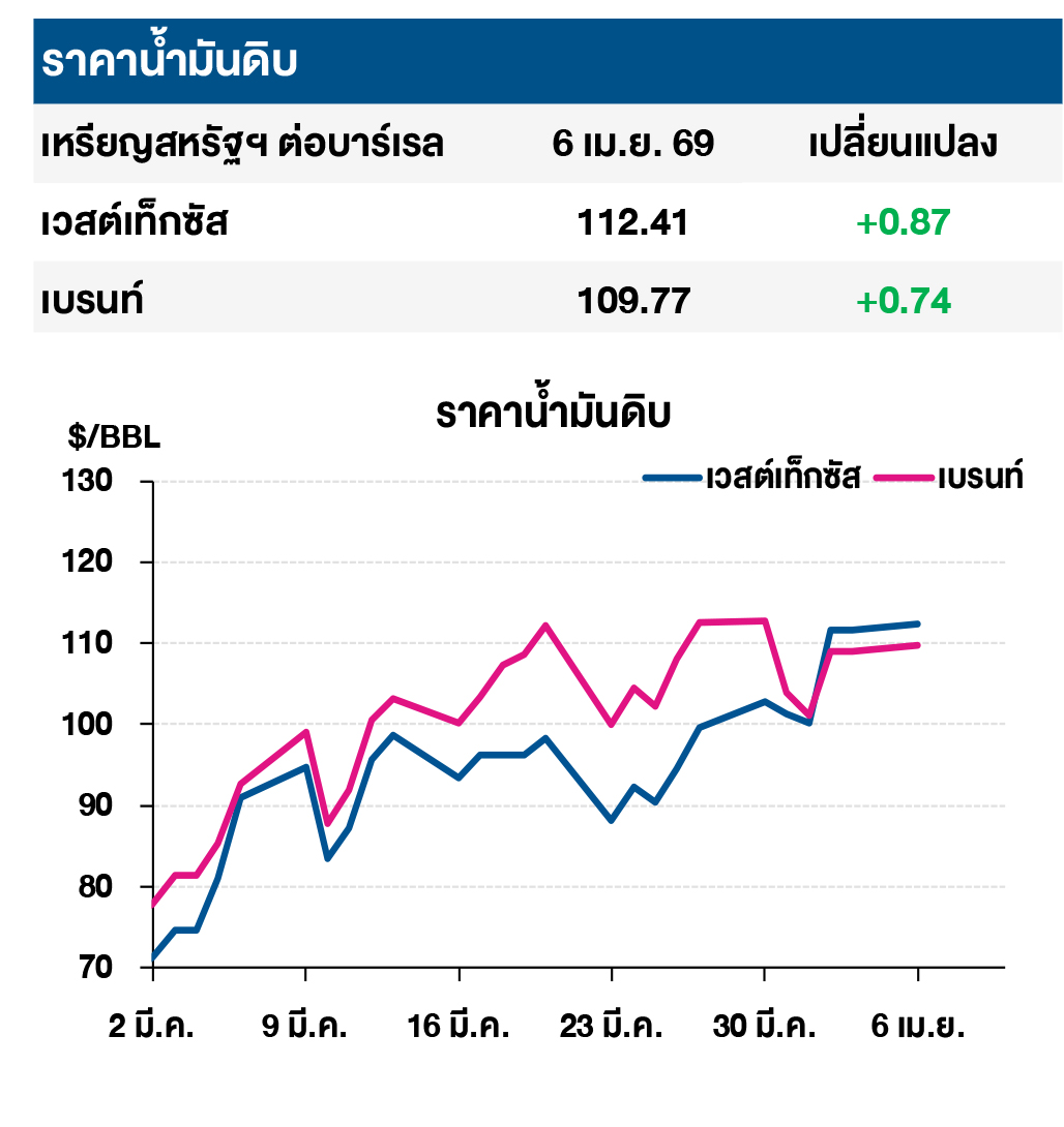 (+) ราคาน้ำมันดิบเวสต์เท็กซัสและเบรนท์ปรับเพิ่มขึ้นเล็กน้อย หลังสหรัฐฯ และอิหร่านได้รับกรอบแผนการยุติความขัดแย้งแล้ว แต่อิหร่านมีการปฏิเสธการหยุดยิงโดยทันทีและยังคงปฏิเสธการเปิดช่องแคบฮอร์มุซอีกครั้ง ประกอบกับประธาธิบดีของสหรัฐฯ โดนัลด์ ทรัมป์ ได้เพิ่มแรงกดดันต่ออิหร่านโดยการขมขู่ว่าจะมีการโจมตีเตหะราน เมืองหลวงของอิหร่าน รวมถึงโครงสร้างพื้นฐานทางพลังงานอย่างโรงไฟฟ้า หากอิหร่านไม่สามารถบรรลุข้อตกลงภายในวันอังคารที่ 7 เม.ย. 69 ทั้งนี้นักวิเคราะห์หลายรายมองว่าสถานการณ์ความขัดแย้งในภูมิภาคตะวันออกกลางยังคงมีความไม่แน่นอนสูง
