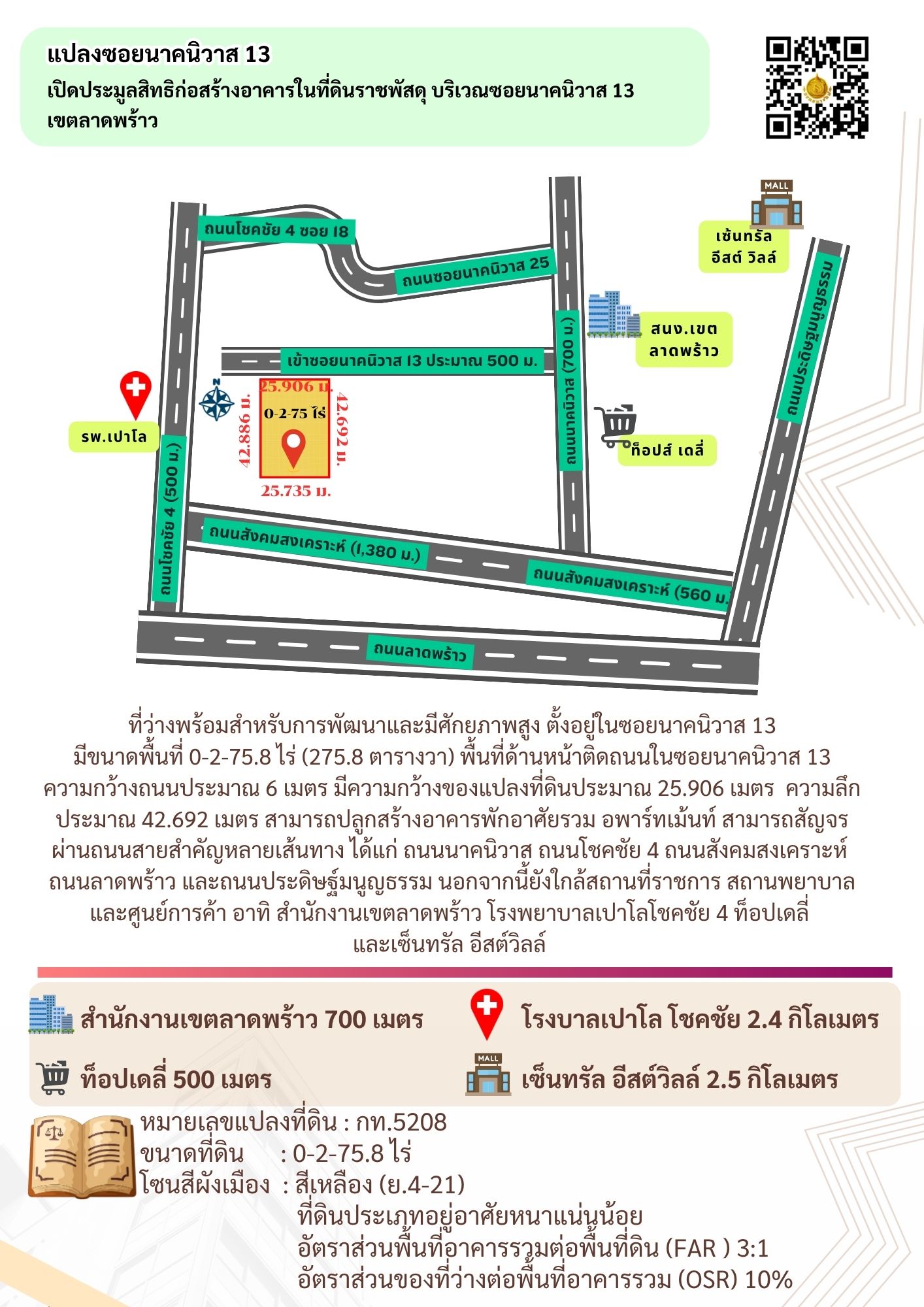 วันนี้ (10 เมษายน 2569) ณ กรมธนารักษ์ นายอัครุตม์ สนธยานนท์ อธิบดีกรมธนารักษ์ เปิดเผยว่า กรมธนารักษ์เปิดประมูลสิทธิก่อสร้างอาคารในที่ดินราชพัสดุ ย่านสำคัญทำเลทอง แปลงหมายเลขทะเบียนที่ กท.5208 เขตลาดพร้าว กรุงเทพมหานคร บนที่ดินเปล่าพร้อมสำหรับการพัฒนาและมีศักยภาพสูง ขนาดพื้นที่ 275.8 ตารางวา โดยพื้นที่ด้านหน้าติดถนนในซอยนาคนิวาส 13 เขตลาดพร้าว หน้ากว้างถนนประมาณ 6 เมตร มีหน้ากว้างของแปลงที่ดินประมาณ 25.906 เมตร ความลึกประมาณ 42.692 เมตร สามารถสัญจรผ่านถนนสายสำคัญหลายเส้นทาง ได้แก่ ถนนนาคนิวาส ถนนโชคชัย 4 ถนนสังคมสงเคราะห์ ถนนลาดพร้าว และถนนประดิษฐ์มนูธรรม นอกจากนี้ ยังใกล้สถานที่ราชการ สถานพยาบาล และศูนย์การค้า อาทิ สำนักงานเขตลาดพร้าว โรงพยาบาลเปาโลโชคชัย 4 ท็อปเดลี่ และเซ็นทรัล อีสต์วิลล์