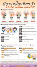 ส่วนการแก้ไขปัญหาของผู้สูงอายุในช่วงที่มีภาวะซึมเศร้า (ถามเฉพาะผู้สูงอายุที่มีอาการอย่างน้อยหนึ่งข้อตามแบบทดสอบภาวะซึมเศร้า PHQ – 9 จำนวน 799 หน่วยตัวอย่าง) พบว่า ผู้สูงอายุ ร้อยละ 42.43 ระบุว่า พูดคุยกับสมาชิกในครอบครัว (คู่สมรส ลูกหลาน ญาติ เป็นต้น) รองลงมา ร้อยละ 36.05 ระบุว่า ออกกำลังกาย ร้อยละ 34.79 ระบุว่า ออกไปพบปะเพื่อนฝูง หรือสังสรรค์กับเพื่อน ร้อยละ 23.65 ระบุว่า เล่น Facebook ร้อยละ 21.03 ระบุว่า เล่น Line ร้อยละ 8.39 ระบุว่า ทำความสะอาดบ้าน ทำสวน ปลูกต้นไม้ ร้อยละ 8.14 ระบุว่า เล่นเกมส์ อ่านหนังสือ ดูหนัง และฟังเพลง ร้อยละ 3.88 ระบุว่า ฟังธรรมะ สวดมนต์ และนั่งสมาธิ ร้อยละ 3.00 ระบุว่า นอนหลับพักผ่อน หรือนั่งเล่นอยู่คนเดียวเงียบ ๆ ร้อยละ 2.50 ระบุว่า ทำงานอาสาสมัคร ร้อยละ 2.25 ระบุว่า เดินทางไปท่องเที่ยว