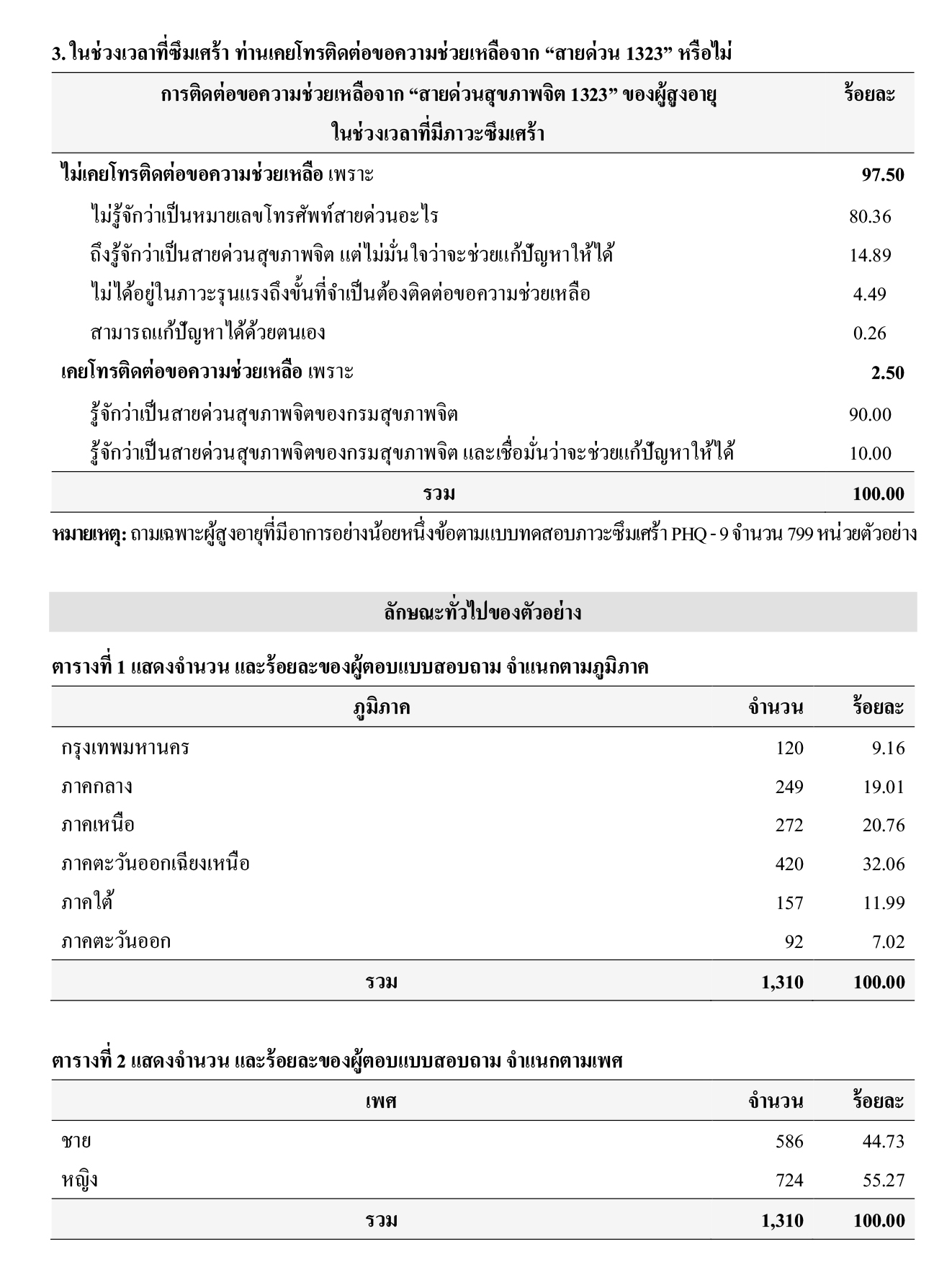 ท้ายที่สุดเมื่อถามผู้สูงอายุถึงการติดต่อขอความช่วยเหลือจาก “สายด่วนสุขภาพจิต 1323” ในช่วงเวลาที่มีภาวะซึมเศร้า (ถามเฉพาะผู้สูงอายุที่มีอาการอย่างน้อยหนึ่งข้อตามแบบทดสอบภาวะซึมเศร้า PHQ – 9 จำนวน 799 หน่วยตัวอย่าง) พบว่า ผู้สูงอายุ ร้อยละ 97.50 ระบุว่า ไม่เคยโทรติดต่อขอความช่วยเหลือ และร้อยละ 2.50 ระบุว่า เคยโทรติดต่อขอความช่วยเหลือ ซึ่งในจำนวนของผู้สูงอายุที่ระบุว่าไม่เคยโทรติดต่อขอความช่วยเหลือจาก “สายด่วนสุขภาพจิต 1323” พบว่า ร้อยละ 80.36 ระบุว่า ไม่รู้จักว่าเป็นหมายเลขโทรศัพท์สายด่วนอะไร รองลงมา ร้อยละ 14.89 ระบุว่า ถึงรู้จักว่าเป็นสายด่วนสุขภาพจิต แต่ไม่มั่นใจว่าจะช่วยแก้ปัญหาให้ได้ ร้อยละ 4.49 ระบุว่า ไม่ได้อยู่ในภาวะรุนแรงถึงขั้นที่จำเป็นต้องติดต่อขอความช่วยเหลือ และร้อยละ 0.26 ระบุว่า สามารถแก้ปัญหาได้ ด้วยตนเอง ส่วนในจำนวนของผู้สูงอายุที่ระบุว่าเคยโทรติดต่อขอความช่วยเหลือจาก “สายด่วนสุขภาพจิต 1323” พบว่า ร้อยละ 90.00 ระบุว่า รู้จักว่าเป็นสายด่วนสุขภาพจิตของกรมสุขภาพจิต และร้อยละ 10.00 ระบุว่า รู้จักว่าเป็น สายด่วนสุขภาพจิตของกรมสุขภาพจิต และเชื่อมั่นว่าจะช่วยแก้ปัญหาให้ได้