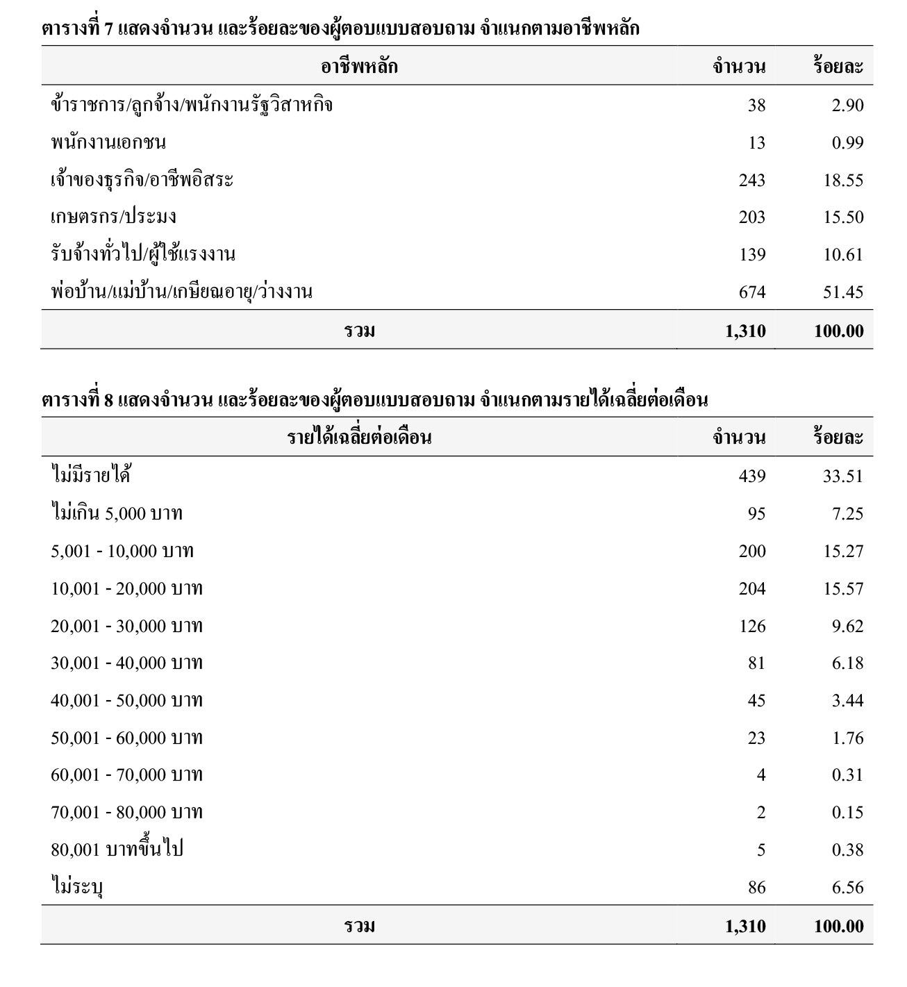 ตัวอย่าง ร้อยละ 33.51 ไม่มีรายได้ ร้อยละ 7.25 รายได้เฉลี่ยต่อเดือนไม่เกิน 5,000 บาท ร้อยละ 15.27 รายได้เฉลี่ยต่อเดือน 5,001 - 10,000 บาท ร้อยละ 15.57 รายได้เฉลี่ยต่อเดือน 10,001 - 20,000 บาท ร้อยละ 9.62 รายได้เฉลี่ยต่อเดือน 20,001 - 30,000 บาท ร้อยละ 6.18 รายได้เฉลี่ยต่อเดือน 30,001 - 40,000 บาท ร้อยละ 3.44 รายได้เฉลี่ยต่อเดือน 40,001 - 50,000 บาท ร้อยละ 1.76 รายได้เฉลี่ยต่อเดือน 50,001 - 60,000 บาท ร้อยละ 0.31 รายได้เฉลี่ยต่อเดือน 60,001 - 70,000 บาท ร้อยละ 0.15 รายได้เฉลี่ยต่อเดือน 70,001 - 80,000 บาท ร้อยละ 0.38 รายได้เฉลี่ยต่อเดือน 80,001 บาทขึ้นไป และร้อยละ 6.56 ไม่ระบุรายได้