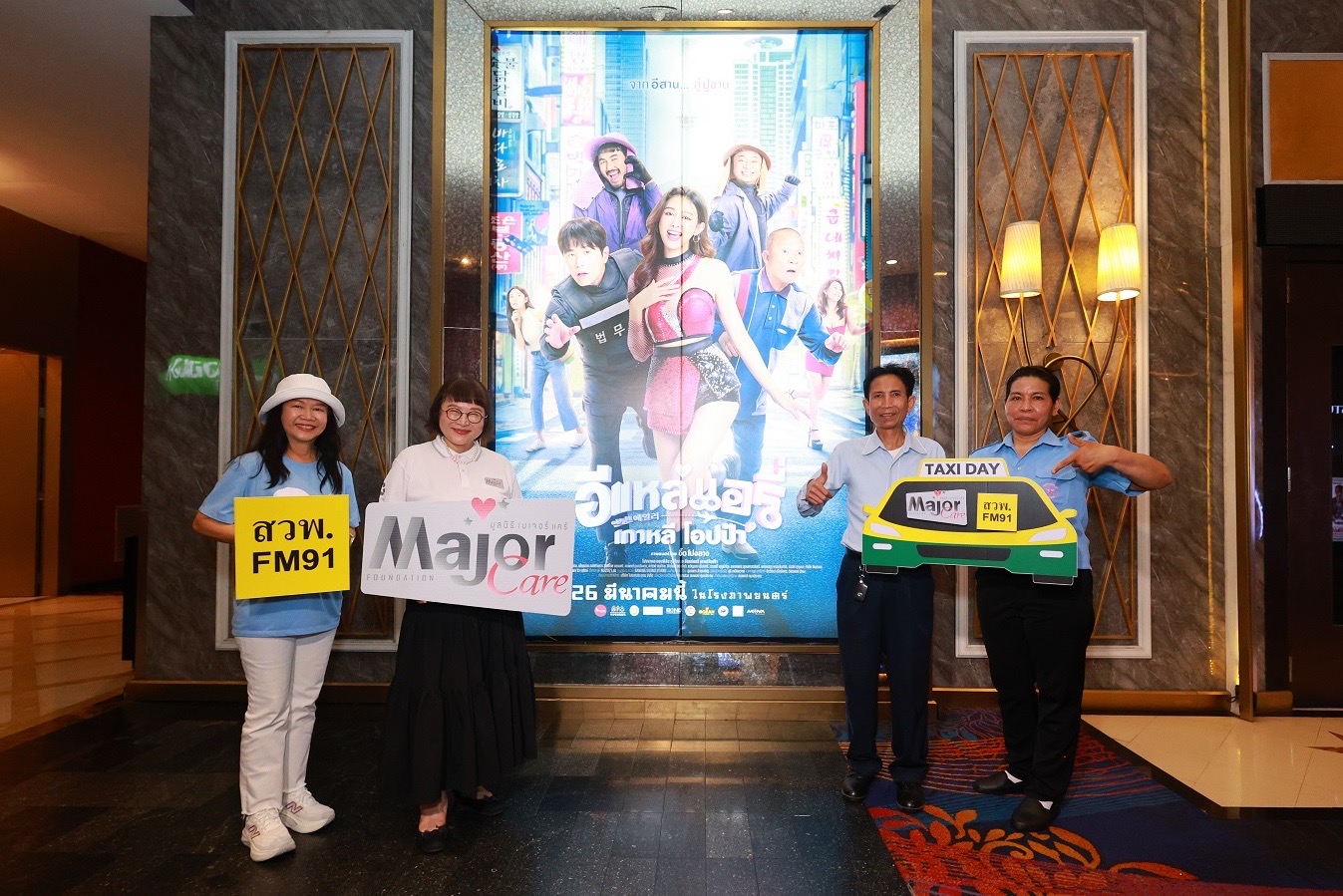 ด้าน ดร.ไจตนย์ ศรีวังพล รองกรรมการผู้จัดการ บริษัท วิไลเซ็นเตอร์ แอนด์ ซันส์ จำกัด ผู้ร่วมดำเนินงานสถานีวิทยุ สวพ.FM91 กล่าวเพิ่มเติมว่า สวพ.FM91 ในฐานะสื่อกลางที่ใกล้ชิดกับพี่น้องผู้ขับขี่แท็กซี่มาอย่างยาวนาน รู้สึกยินดีที่ได้ร่วมกับ มูลนิธิ เมเจอร์ แคร์ อีกครั้ง สำหรับปีนี้เราเลือกภาพยนตร์เรื่อง “อีแหล่ แอรี่ เกาหลี โอปป้า” มาจัดฉาย เนื่องจากเป็นผลงานที่สะท้อนชีวิตคนทำงานที่ต้องพลัดถิ่นเพื่อครอบครัว ซึ่งเชื่อว่าจะเข้าถึงใจและสร้างความสุขให้กับพี่น้องแท็กซี่ได้เป็นอย่างดี โดยผู้ขับขี่สามารถลงทะเบียนรับสิทธิ์ผ่านสายด่วน 1644 ของเราได้ฟรี ตลอด 24 ชั่วโมง
