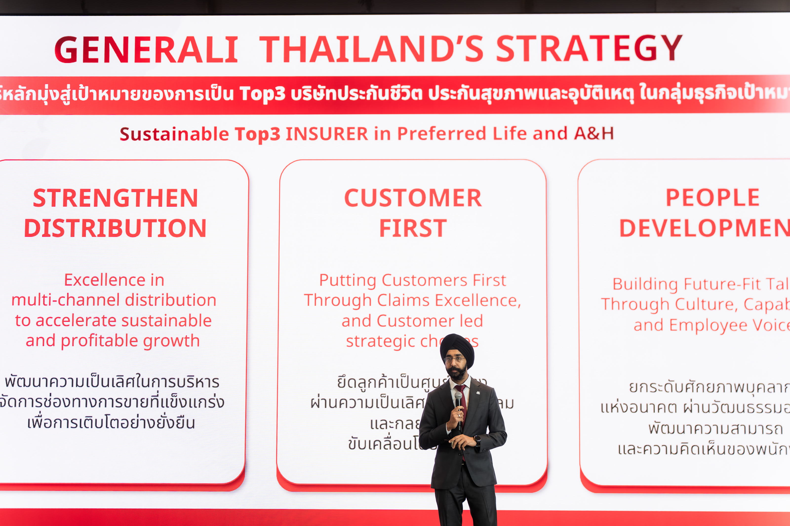 นายอาร์ช กล่าวต่อว่า “สำหรับปี 2026 คาดว่าจะเป็นอีกปีที่ท้าทาย โดยบริษัทประกันภัย จำเป็นต้องคำนึงถึงบริบทโลกที่เปลี่ยนแปลงอย่างต่อเนื่อง ทั้งความเสี่ยงด้านภูมิรัฐศาสตร์ ภาวะเงินเฟ้อ และความผันผวนทางเศรษฐกิจซึ่งส่งผลให้ผู้บริโภคให้ความสำคัญกับการบริหารความเสี่ยงด้านสุขภาพและความเสี่ยงการเงินมากยิ่งขึ้น ดังนั้น เจนเนอราลี่ ไทยแลนด์ จึงได้เตรียมต่อยอดกลยุทธ์การดำเนินธุรกิจด้วยการเสริมแกร่ง 3 เสาหลัก โดยแบ่งเป็นการยกระดับช่องทางการขายผ่านการนำดิจิทัลเทคโนโลยีมาเพิ่มประสิทธิภาพการทำงาน (Digitalization) การเสริมศักยภาพให้พันธมิตรด้วยเครื่องมือการขายดิจิทัลที่เชื่อมต่ออย่างไร้รอยต่อ การปรับเปลี่ยนกระบวนการทำงาน (process transformation) โดยยึดความเข้าใจและความเห็นอกเห็นใจต่อพันธมิตรด้านการจัดจำหน่าย โดยมีลูกค้าเป็นศูนย์กลาง รวมถึงการพัฒนาผลิตภัณฑ์ (product customization)ให้สามารถตอบโจทย์ความต้องการของลูกค้าได้อย่างครอบคลุม