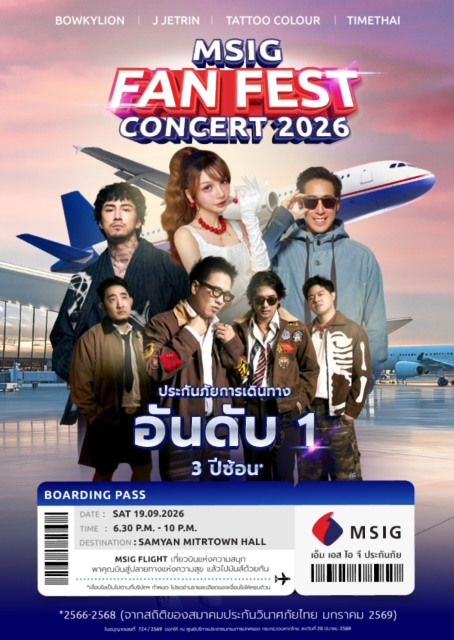 เพื่อขอบคุณและตอบแทนลูกค้าที่ให้ความไว้วางใจกว่า 10 ปีในผลิตภัณฑ์ประกันภัยเดินทางต่างประเทศของบริษัท MSIG เตรียมจัดคอนเสิร์ตใหญ่ “MSIG Fan Fest 2026” พร้อมมอบสิทธิพิเศษสำหรับผู้ที่ซื้อประกันภัยการเดินทาง MSIG Travel Easy Plus ระหว่างวันที่ 1 เมษายน – 30 มิถุนายน 2569 ดังนี้ ต่อที่ 1 มีสิทธิรับ Starbucks e-Coupon มูลค่าสูงสุด 600 บาทต่อท่าน และ ต่อที่ 2 รับสิทธิ์ลุ้นบัตรเข้าชมคอนเสิร์ตจำนวน 600 ที่นี่ง (2 ที่นั่งต่อ 1 สิทธิ์) โดยผู้เอาประกันภัย 1 ท่าน จะได้รับ 1 สิทธิ์ในการลุ้นรับบัตรคอนเสิร์ต ทั้งนี้ต้องชำระเบี้ยประกันภัย และไม่มีการยกเลิกกรมธรรม์