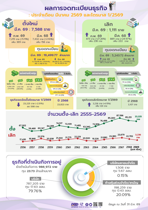 (ข้อมูล ณ วันที่ 31 มีนาคม 2569) พบว่า มีธุรกิจที่จดทะเบียนนิติบุคคลรวมทั้งสิ้น 2,073,303 ราย ทุนจดทะเบียนรวม 32.22 ล้านล้านบาท โดยมีนิติบุคคลดำเนินกิจการอยู่ 986,972 ราย ทุนจดทะเบียนรวม 23.73 ล้านล้านบาท แบ่งเป็นบริษัทจำกัด 787,205 ราย คิดเป็น 79.76% ของจำนวนนิติบุคคลที่ดำเนินกิจการอยู่ทั้งหมด ทุนจดทะเบียนรวม 17.63 ล้านล้านบาท ห้างหุ้นส่วนจำกัดและห้างหุ้นส่วนสามัญนิติบุคคล 198,259 ราย คิดเป็น 20.09% ของจำนวนนิติบุคคลที่ดำเนินกิจการอยู่ทั้งหมด ทุนจดทะเบียนรวม 0.43 ล้านล้านบาท และบริษัทมหาชนจำกัด 1,508 ราย คิดเป็น 0.15% ของจำนวนนิติบุคคลที่ดำเนินกิจการอยู่ทั้งหมด ทุนจดทะเบียนรวม 5.67 ล้านล้านบาท