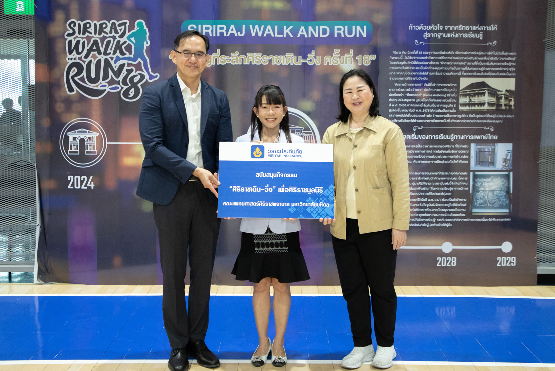 อ.ดร.พญ.ถิรจิต บุญแสน ผู้ช่วยคณบดีฝ่ายสร้างเสริมสุขภาพ คณะแพทยศาสตร์ศิริราชพยาบาล มหาวิทยาลัยมหิดล รับมอบเงินสนับสนุนกิจกรรม "ศิริราช เดิน - วิ่ง ครั้งที่ 18" จำนวน 100,000 จาก บริษัท วิริยะประกันภัย จำกัด (มหาชน) โดยมี นายพงศ์พันธ์ ประภาศิริลักษณ์ ผู้จัดการฝ่ายสื่อสารองค์กร เป็นผู้แทนมอบ เพื่อส่งเสริมให้ประชาชนตระหนักถึงความสำคัญของการออกกำลังกาย ซึ่งเป็นรากฐานสำคัญในการลดความเสี่ยงของการเจ็บป่วยและเสริมสร้างสุขภาพที่แข็งแรงอย่างยั่งยืน สะท้อนถึงความมุ่งมั่นของวิริยะประกันภัยในการร่วมสนับสนุนกิจกรรมที่เป็นประโยชน์ต่อสังคม อันนำไปสู่การยกระดับคุณภาพชีวิตของประชาชน และการสร้างสังคมแห่งสุขภาวะที่เข้มแข็งและยั่งยืนต่อไปในอนาคต ณ อาคารหอกีฬาสัมพันธ์ คณะแพทยศาสตร์ศิริราชพยาบาล เขตบางกอกน้อย กรุงเทพฯ