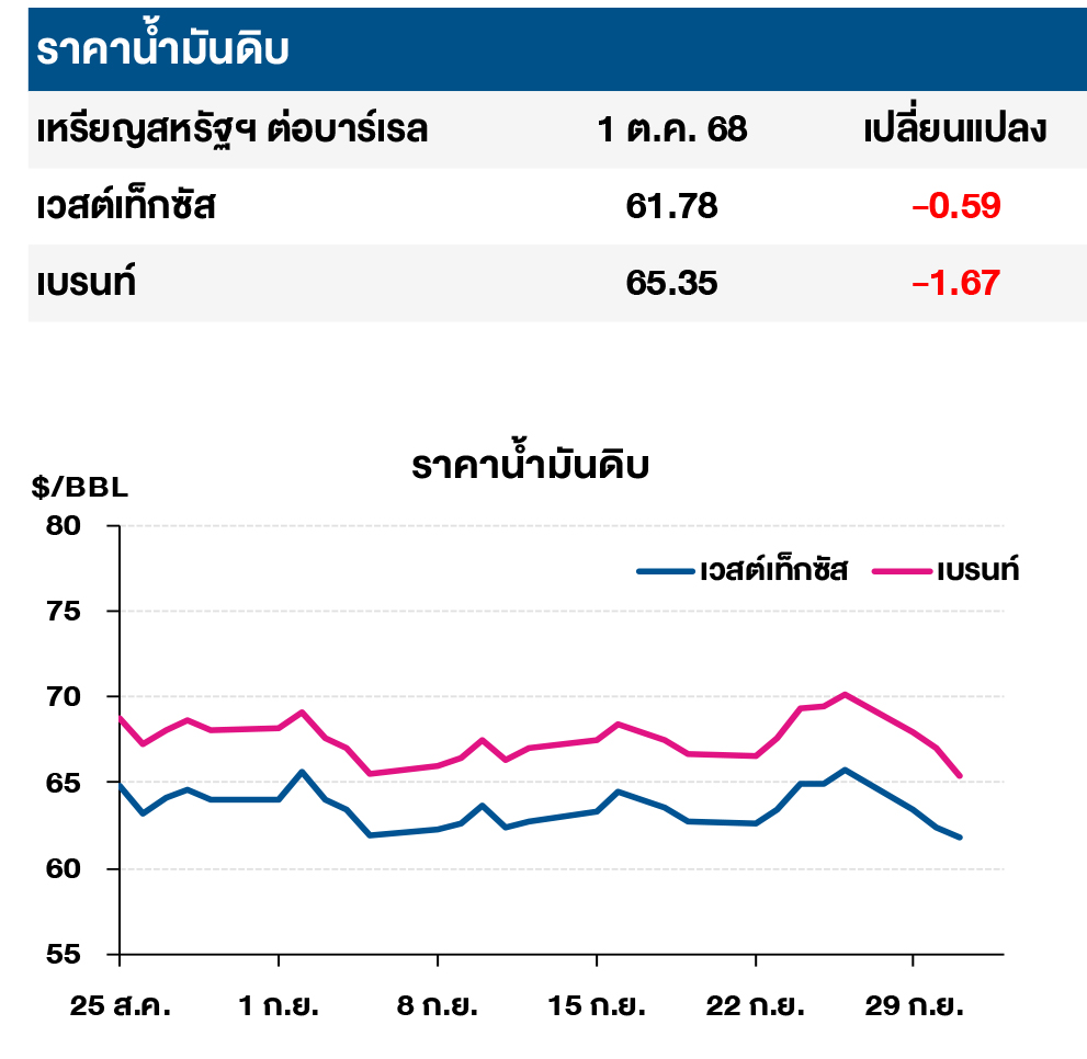 (-/+) ราคาน้ำมันดิบเวสต์เท็กซัส และเบรนท์ปรับลดลงอย่างต่อเนื่องเป็นวันที่ 3 และเป็นระดับที่ต่ำที่สุดในรอบ 16 สัปดาห์ที่ผ่านมา หลังตลาดกังวล OPEC+ ที่อาจปรับเพิ่มกำลังการผลิตน้ำมัน เดือน พ.ย. 68 ที่ระดับ 0.5 ล้านบาร์เรลต่อวัน โดยเป็นการเพิ่มมากกว่าเดือน ต.ค. 68 ราว 3 เท่า เนื่องจากประเทศซาอุดิอาระเบียต้องการทวงคืนส่วนแบ่งการตลาด อย่างไรก็ตาม ทางกลุ่มได้ออกมาปฏิเสธแผนการเพิ่มการผลิตดังกล่าว และเน้นย้ำว่าเพิ่มเติมยังคงมีบางประเทศในกลุ่มที่ผลิตเกินกว่าโควต้าที่ได้รับ และจำเป็นต้องลดกำลังการผลิตน้ำมันดิบชดเชย