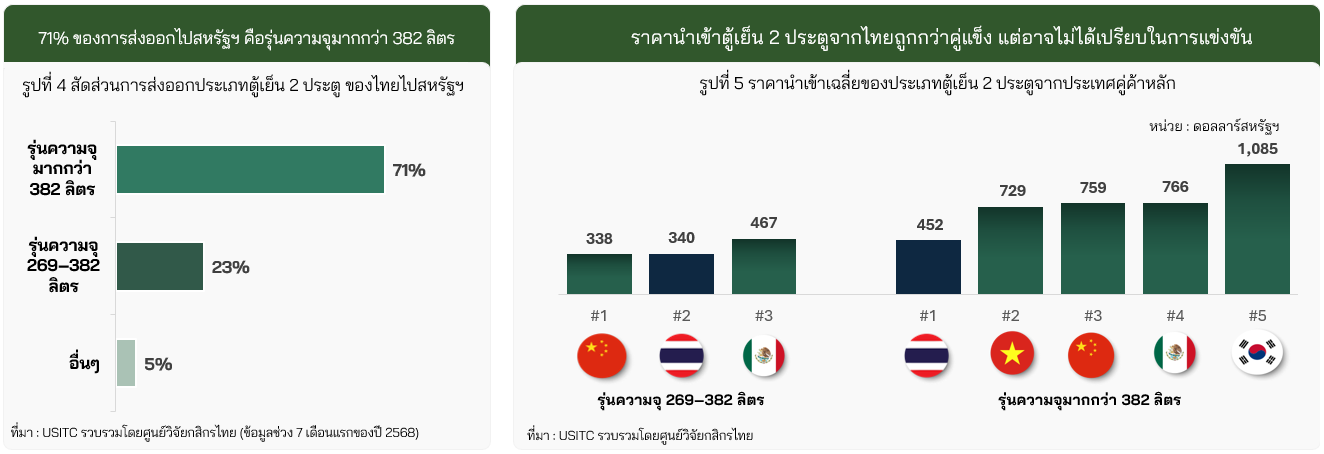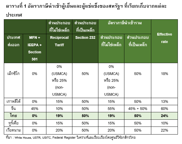 การที่สหรัฐฯ เรียกเก็บภาษีนำเข้าแบบตอบโต้ (Reciprocal Tariff) จากไทยในอัตรา 19% รวมถึงภาษีส่วนประกอบเหล็กในอัตรา 50% ภายใต้ Section 232 ส่งผลให้ต้นทุนการส่งออกตู้เย็นและตู้แช่แข็งไปสหรัฐฯ เพิ่มขึ้น