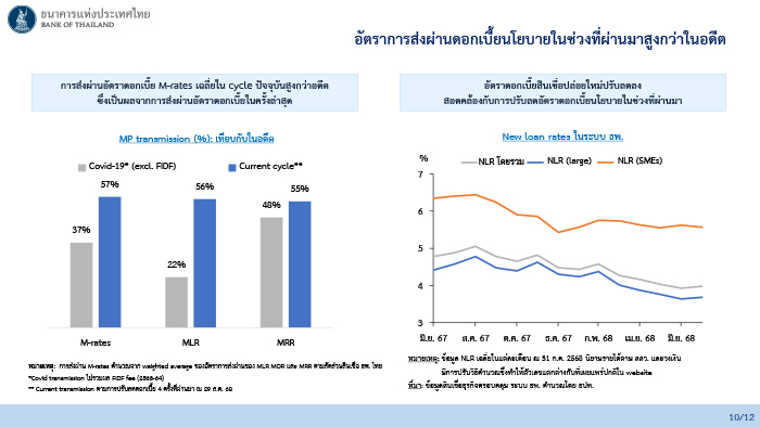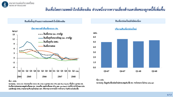เศรษฐกิจในปี 2568 และ 2569 มีแนวโน้มขยายตัวใกล้เคียงกับที่เคยประเมินไว้ โดยภาคส่งออกเริ่มได้รับผลกระทบจากมาตรการภาษีสหรัฐฯ ขณะที่การท่องเที่ยวและอุปสงค์ในประเทศมีแนวโน้มชะลอลงก่อนจะทยอยฟื้นตัวในระยะข้างหน้า ด้านอัตราเงินเฟ้อทั่วไปต่ำกว่าที่ประเมินไว้จากราคาในหมวดพลังงานและอาหารสดเป็นสำคัญ แต่ยังไม่เห็นสัญญาณการปรับลดลงของราคาสินค้าเป็นวงกว้าง ด้านสินเชื่อรวมยังหดตัวและคุณภาพสินเชื่อกลุ่มเปราะบางยังด้อยลง